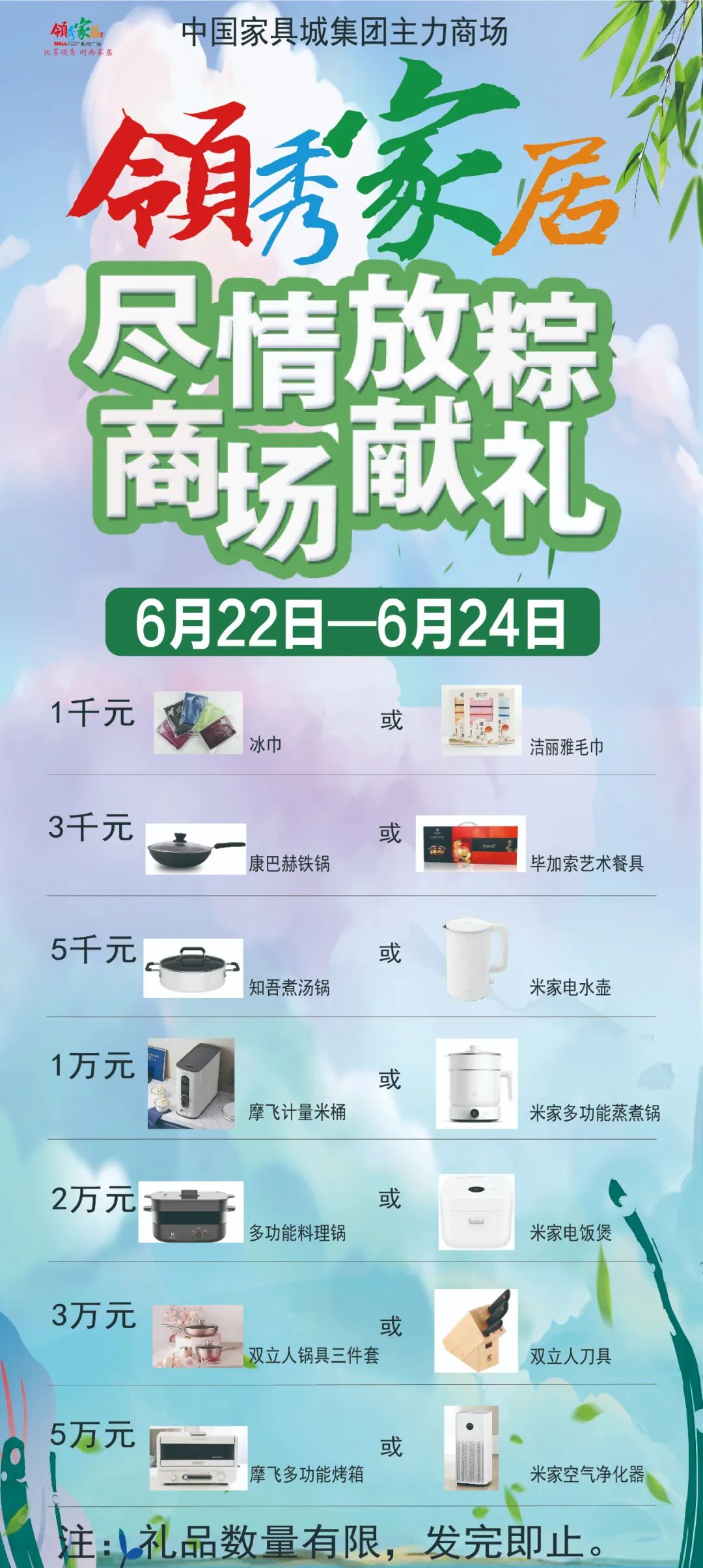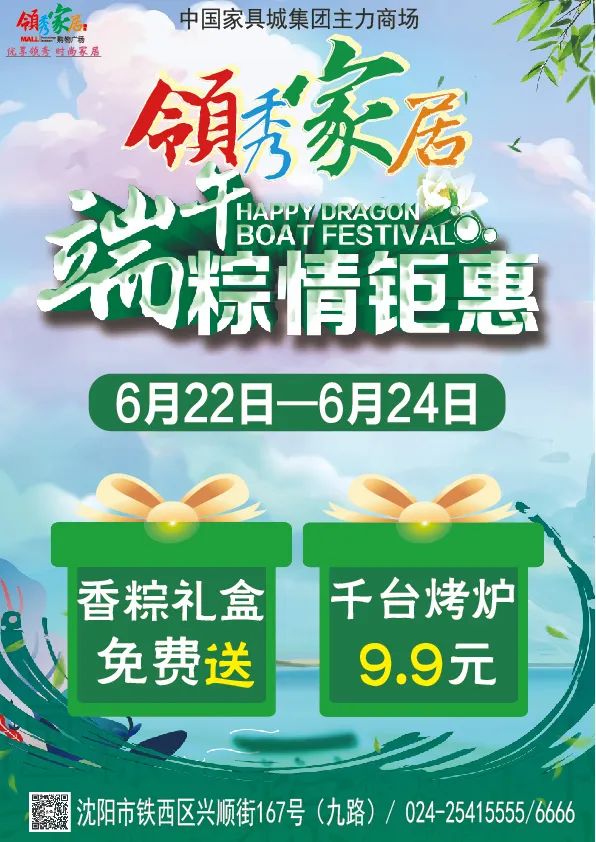 领秀家居端午粽情钜惠!6月22至24日,无需购物即可9.9元换购便携烤炉,购物还可畅享多重好礼。领秀家居25416666!