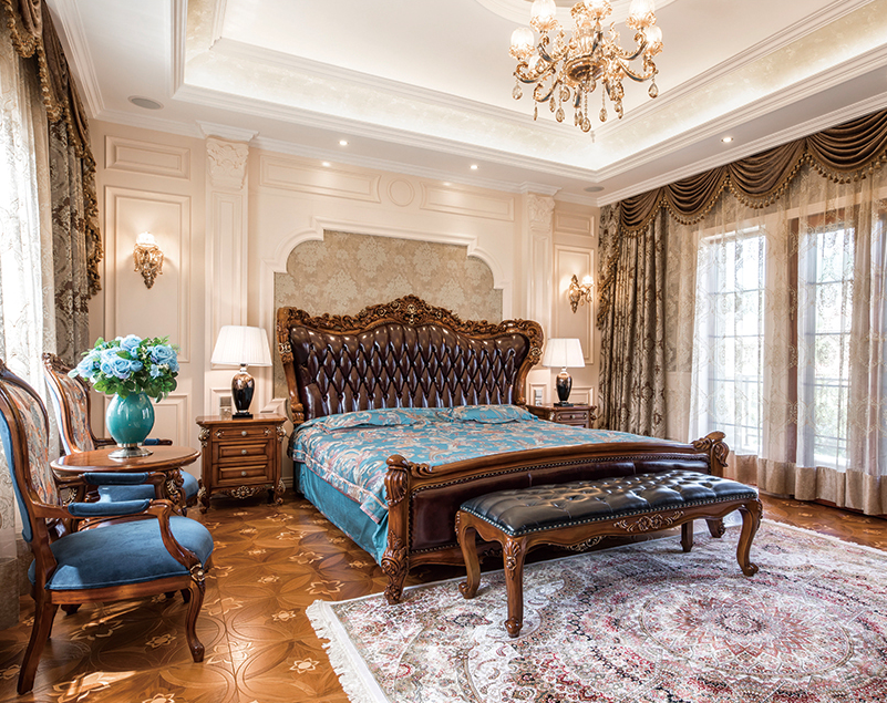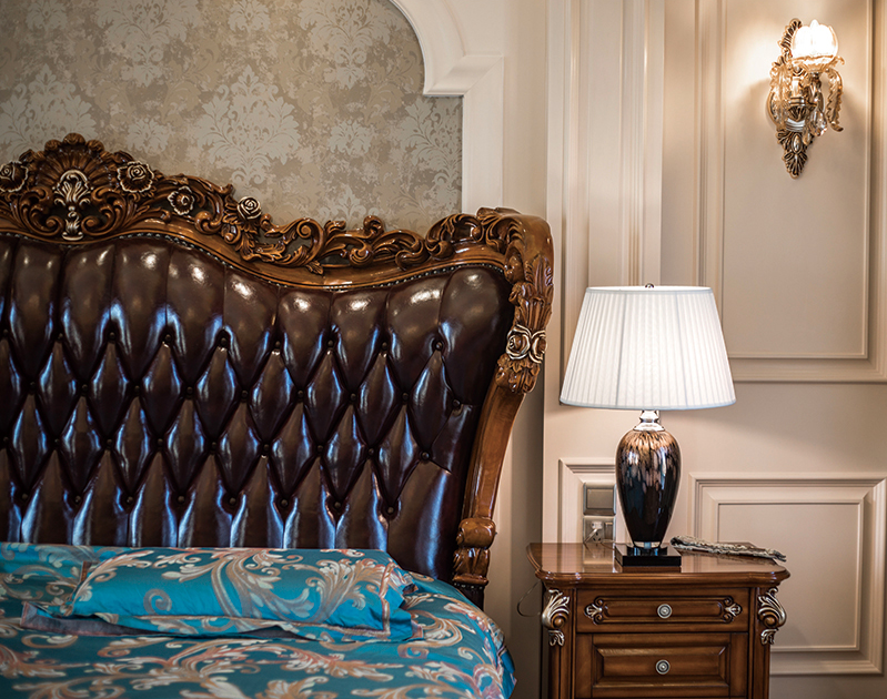 欧式雕花床头、床头柜均为实木材质,雕花的细节处理上十分细致。灯饰较为简约,但在奢华空间中却异常和谐。