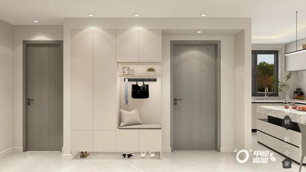 入户玄关是家居最不多余的一处设计,功能性实用性不言而喻,在不浪费空间的前提下实现了不局促的格局设计。有藏有露,集收纳功能性及美观颜值为一体;随手区、换鞋凳、通勤鞋区、展示区、储物柜笼括其中,灵活满足居者出门入户的多样化需求,随时可变、随时可增。