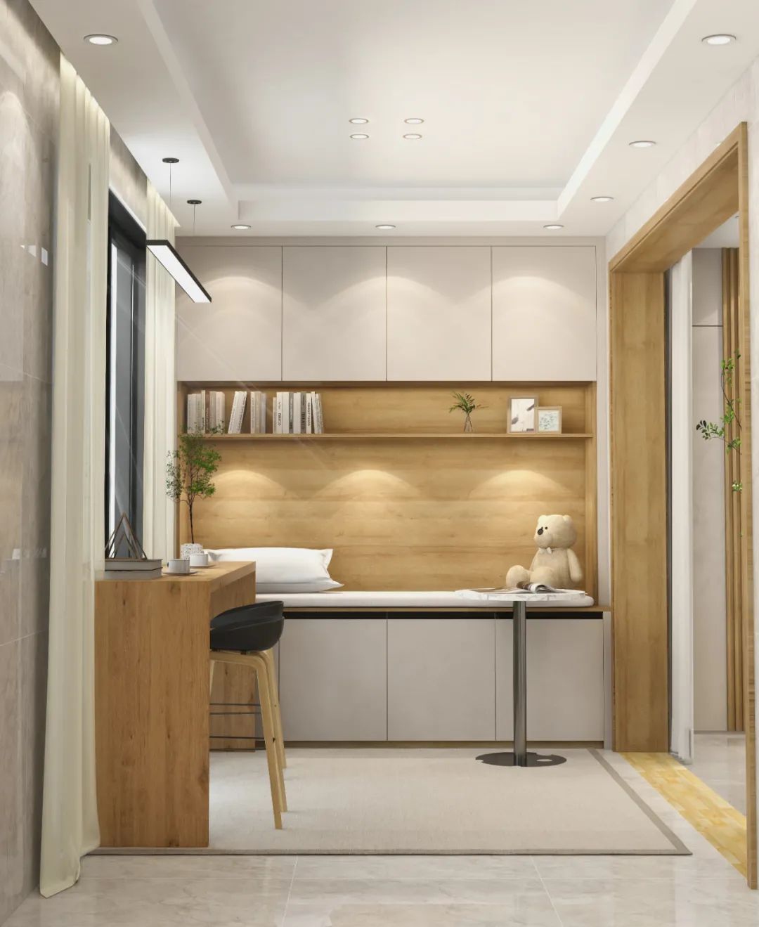 不同于艳丽的儿童房设计,柜体配色采用永不过时的中性色,孩子不同年龄段可以通过软装的不同搭配来实现不同年龄段的心理需求。房间虽小,五脏俱全,休息区,学习区,储物区,玩具收纳柜都融合在内,书柜和床头柜链接的设计,让空间在色彩和功能上达成统一。孩子拥有自己独立的小天地,让每一个梦境都充满甜蜜。