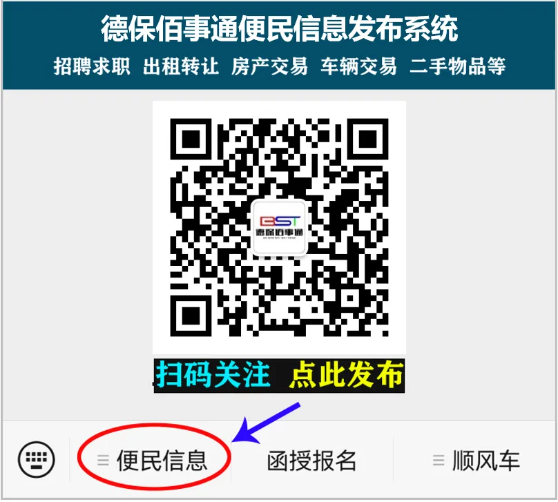 现在您不用到街头辛苦的贴广告、发传单就可以有效的发布广告啦!德保佰事通目前已经开通“便民信息”栏,信息涵盖招聘求职、房屋租售、出租转让、二手物品、汽车交易、农林牧渔、寻人寻物、征婚交友、顺风车、本地服务、等等信息发布!