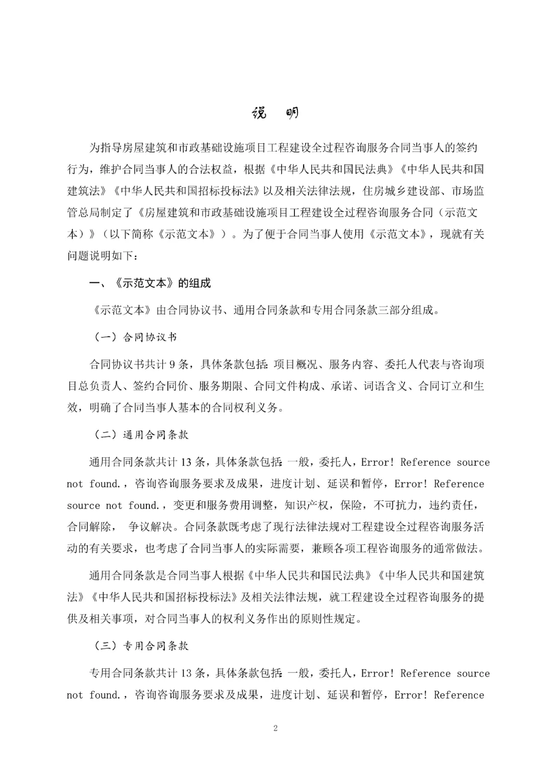 为促进工程建设全过程咨询服务发展,维护工程建设全过程咨询服务合同当事人的合法权益,住房城乡建设部、市场监管总局制定了《房屋建筑和市政基础设施项目工程建设全过程咨询服务合同(示范文本)》,现印发给你们,供参考使用。使用过程中如有问题,请及时与住房城乡建设部建筑市场监管司、市场监管总局网络交易监督管理司联系。