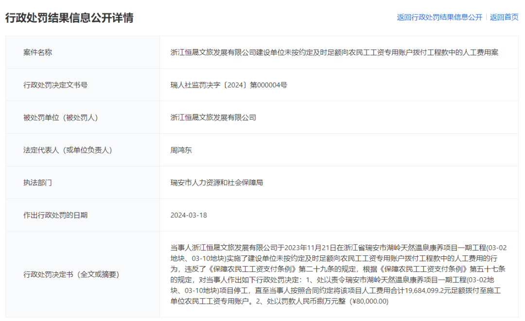 瑞安市人力资源和社会保障局直接勒令该公司按照合同约定将该项目人工费用合计19,684,099.2元足额拨付至施工单位农民工工资专用账户;恒晟公司也因未按照约定拨付农民工工资而被责令停工,并被处以罚款人民币8万元整。