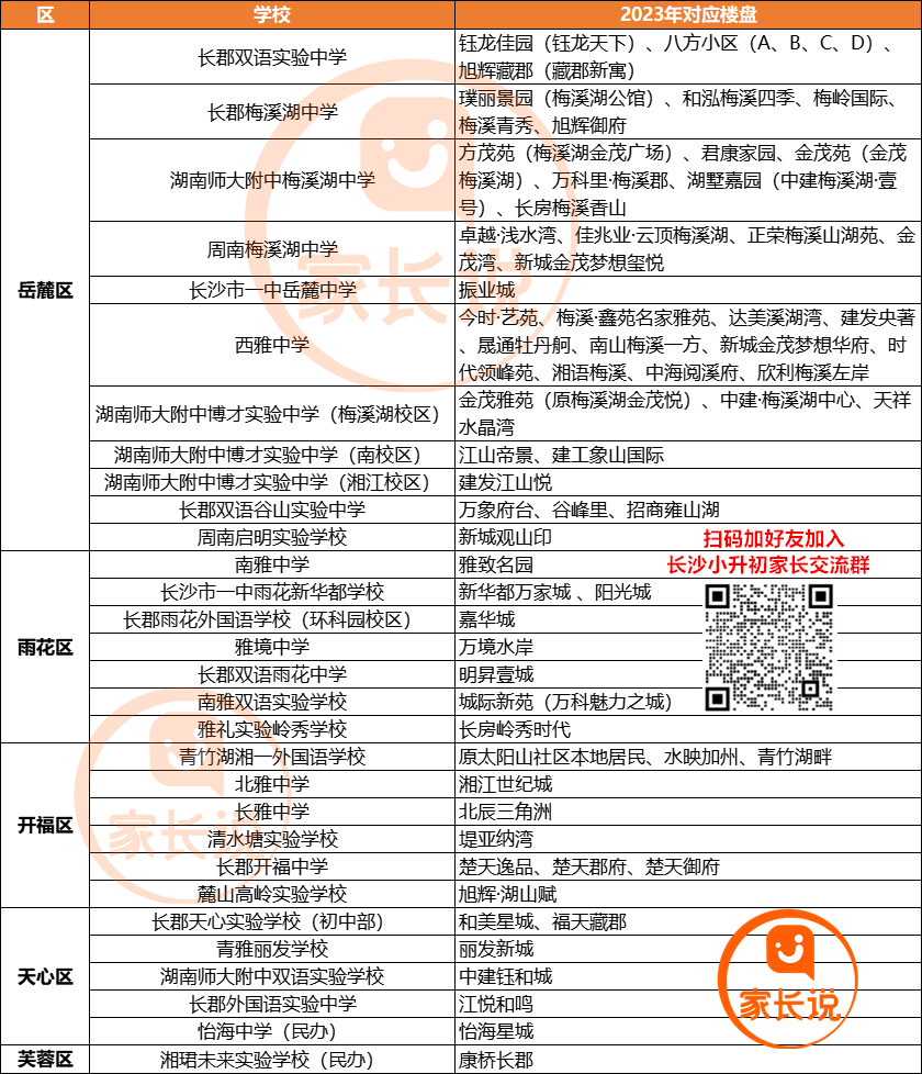 以上配套楼盘和学校根据2023年网报系统整理,大家可以先参考。从近两年的情况看,每年都有新增一些新的配套楼盘和学校,届时报名系统会更新。扫上面的二维码码加好友加入长沙小升初交流群,也可以获取最新的升学政策和招生报名信息。