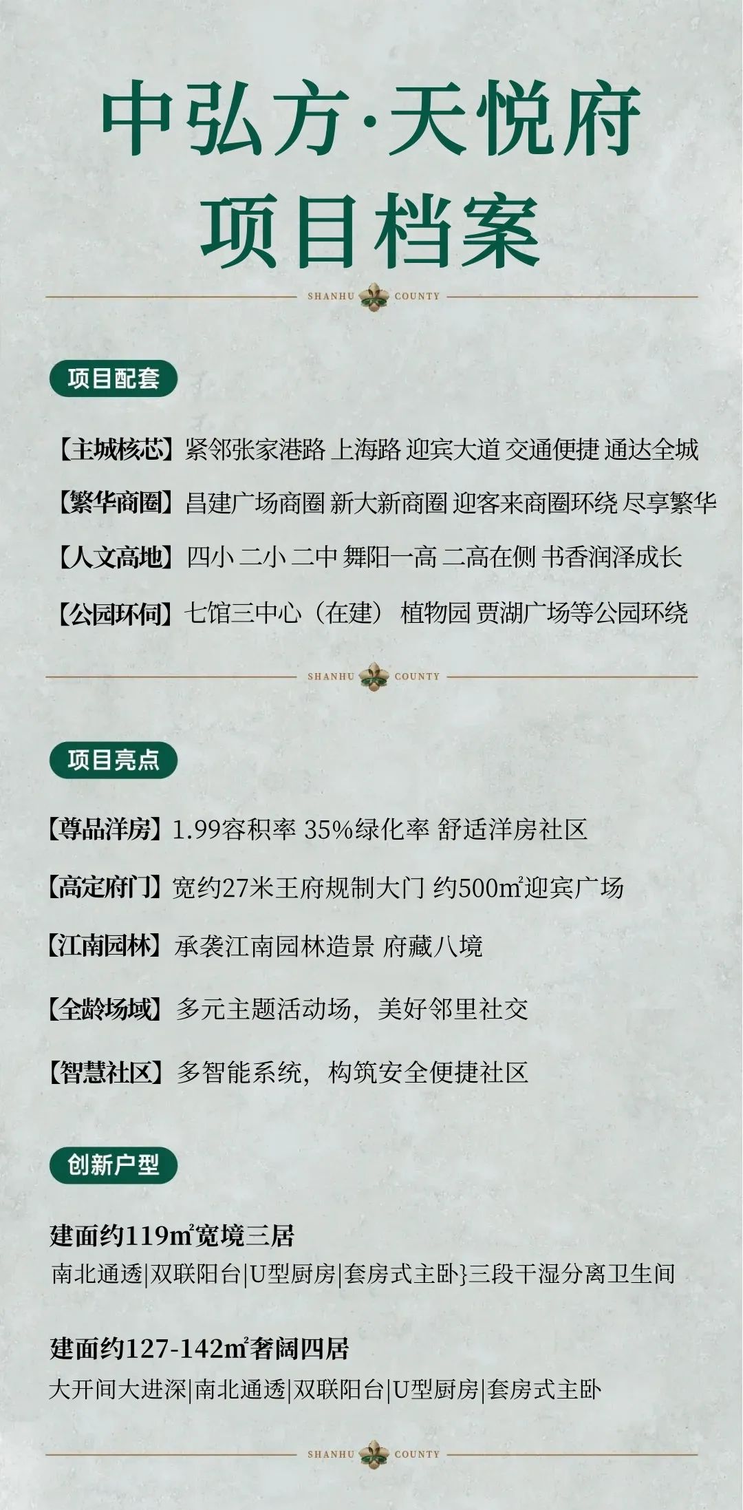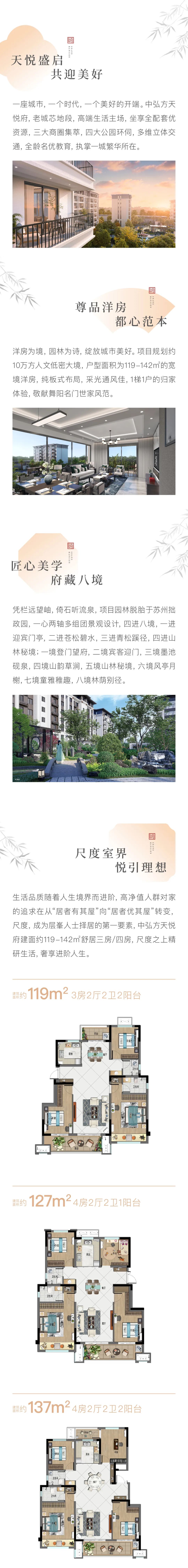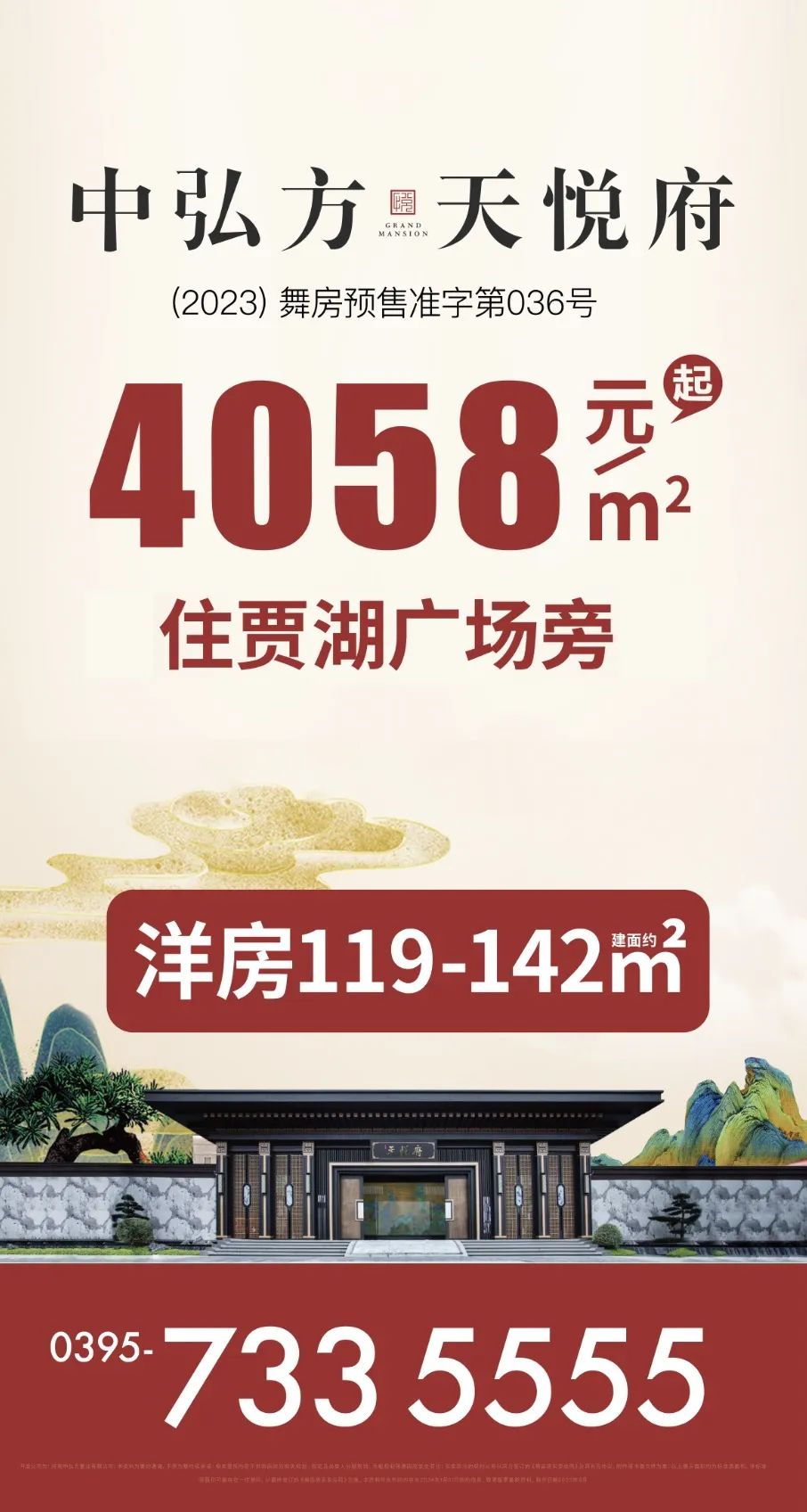 免责声明:1.本资料为要约邀请,不作为邀约或承诺;买卖双方的权利义务以双方签订的《商品房买卖合同》及其补充协议,附件等书面文件为准。2.相关宣传内容不排除因政府相关规划、规定及出卖人分期规划、未能控制等原因发生变化。3、本宣传资料所体现的市政配套,包含商业、教育、医疗、公园等配套内容,仅为本宣传资料印发之前的相关报道,具体情况以政府发布的公告为准,本公司对此不做任何承诺。4.在法律允许的范围内,本资料的最终解释权归中弘方天悦府所有。(2023)舞房预售准字第036号