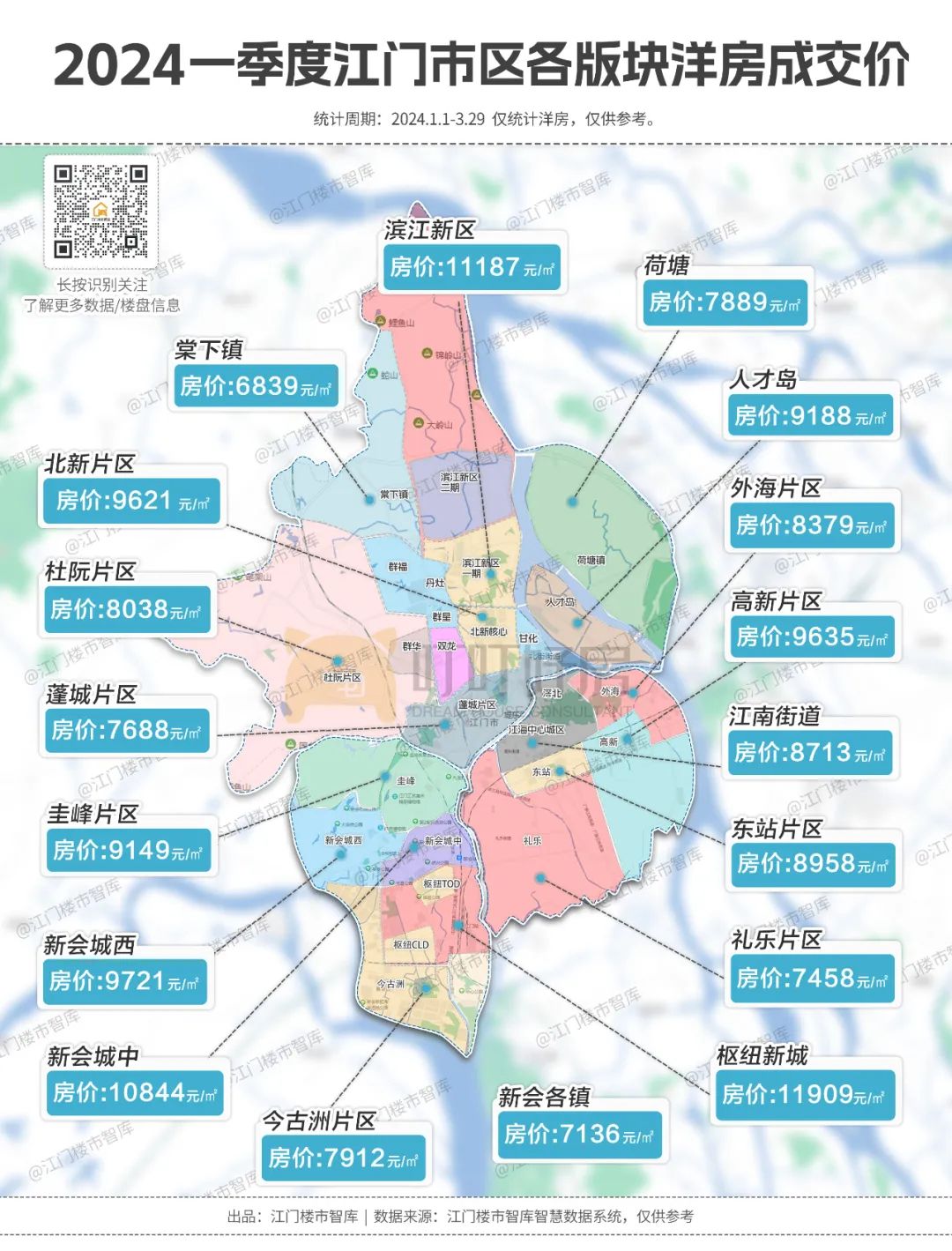 根据【江门楼市智库】智慧数据系统显示:2024年一季度(1.1-3.29)江门三区住宅成交均价10132元/㎡,其中洋房成交均价约9918元/㎡。