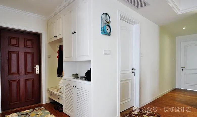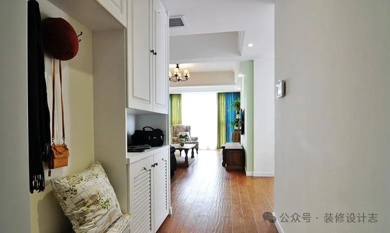 反过来,看玄关。很清新漂亮。尤其是玄关柜的设计,预设了一个凹槽,下面可坐,上面有挂钩挂衣物包包;