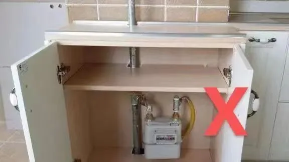 燃气具下方的橱柜设置推拉式抽屉或拉笼时,须注意留存空间,防止抽屉或拉笼来回推拉以碰挤燃气具万向节连接软管,在入住后使用抽屉过程中,注意不能用力推拉。致使软管脱落或断裂,引发燃气泄漏。