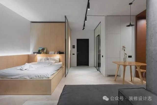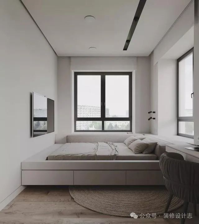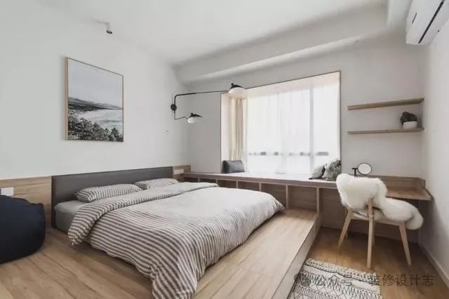 例如:你可以将床靠墙放置,空出充足的通道和活动室内空间,随后在床头多余的位置塞下一张小书桌,规划出相对比较科学合理的生活动线。
