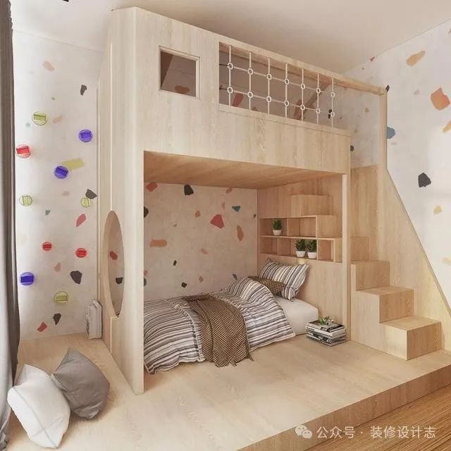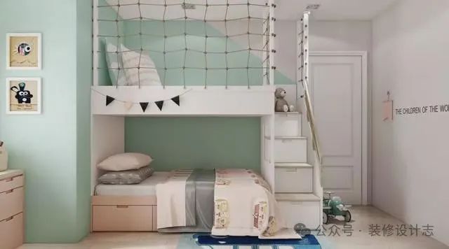 二胎家庭还能够选用上下铺的设计构思,将垂直室内空间灵活运用起来,让小孩子拥有相对性独立的室内空间,培养他们的自主性。