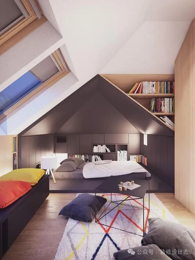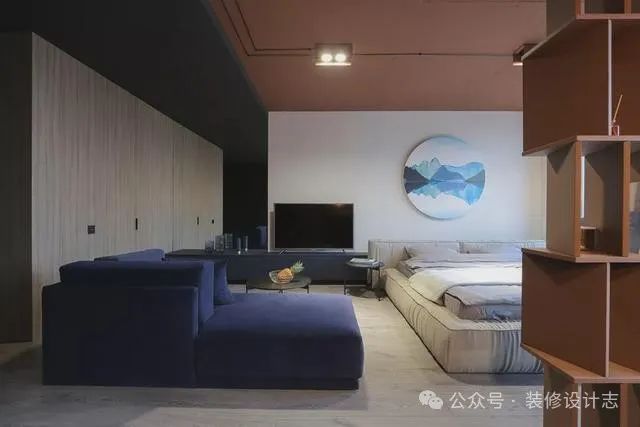 自然,像下边这种将整个双人床与沙发区、学习区融合起来的设计方案,也能够合理利用每一处室内空间,创造一种轻轻松松舒适的生活气氛。