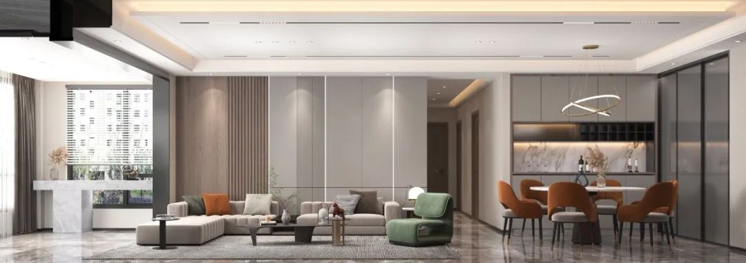 如果还是想稍微区分下客厅与餐厅,可以在中间定制一个吧台,用于放置菜品及餐具,或者作为临时办公区使用,功能性满满!中间摆放沙发也能起到简单分隔空间的作用,美观又实用。
