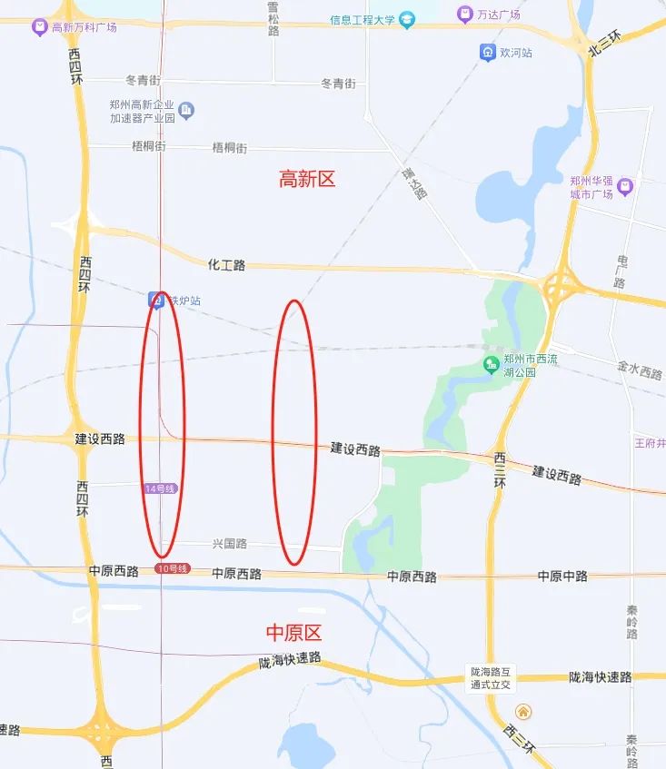 高新区与中原区只有通过西四环和西三环两条快速路进行连接,长椿路、雪松路等路网均因为铁路的问题无法完全贯通。