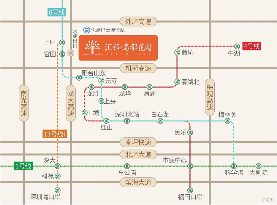 高效交通,链接全城 项目位于龙大高速水朗出口旁,邻近地铁6号线(已开通)及13号线(在建)。畅享龙大、南光、广深、机荷四大高速路网,社区接驳优点巴士,六条短线直达六大地铁站,三条快线直达大剧院/ 车公庙/ 科技园等中心区。