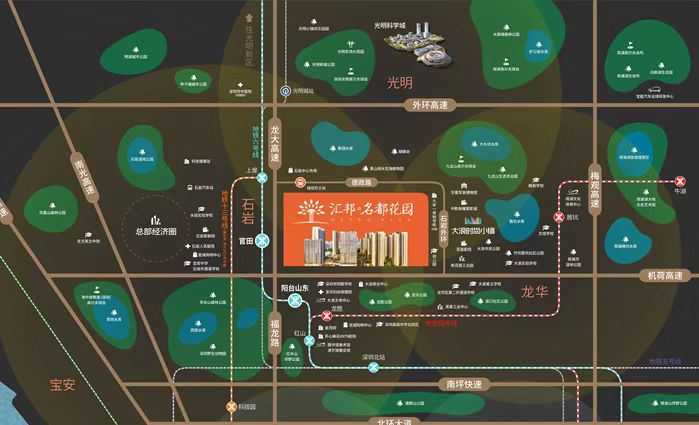 深港中轴,榜样湾区 ;深圳西进门户宝安“ 三带两心一谷 ”战略实施, 石岩市政、交通、文旅、教育等十大产业投建。项目地处宝安、龙华、光明黄金三角交汇带,区域形成“两轴五区”产业格局;汇邦名都花园坐落于深圳中轴发展带上,中部组团发展中心,临近龙大高速及福龙路,通过福龙路可便捷对接市中心区。