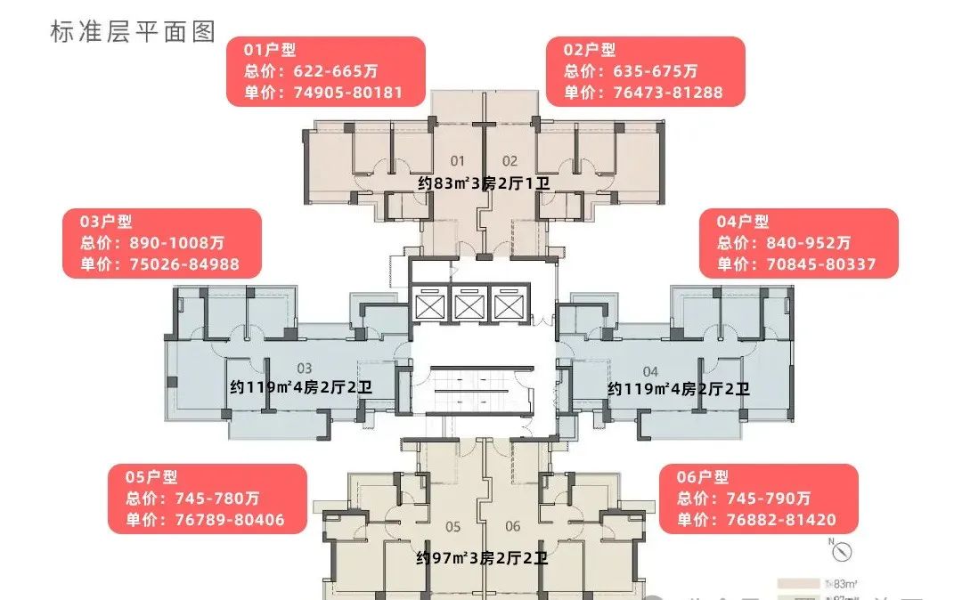 面积:约83-97-119㎡3-4房