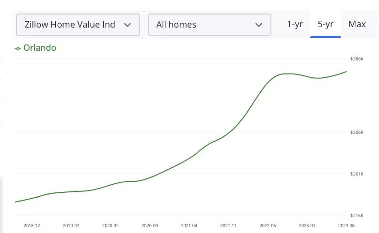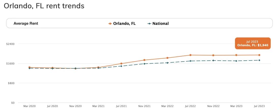 Zillow数据:2023年8月奥兰多地区的房屋价值平均约38.5万美元。出租屋平均约1950美元,高于全美平均数值。