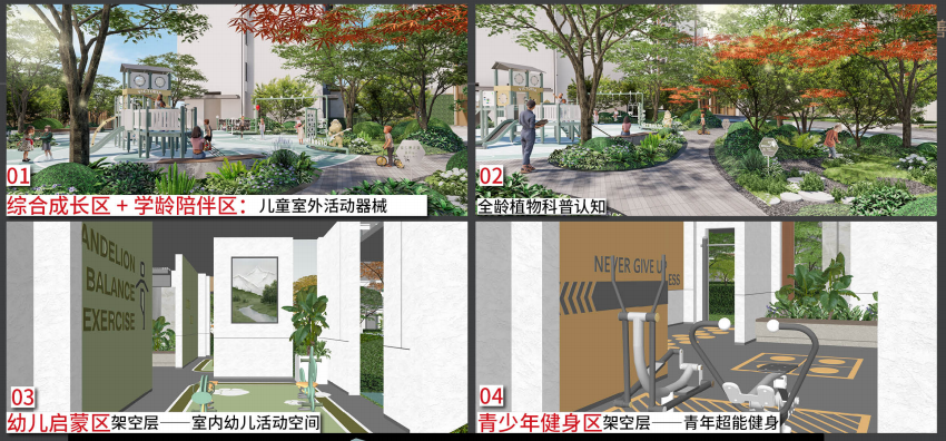 社区内部还专门打造了约1900㎡的高品质阳光草坪空间,“动+静”结合,预留13种运动模块。