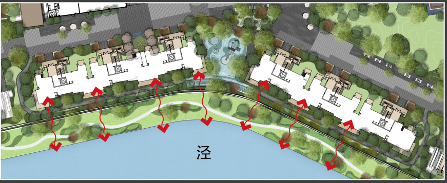 比如社区内约190米水岸漫步道,闲暇时光,林荫滨河漫步,享受独有的静谧时光。