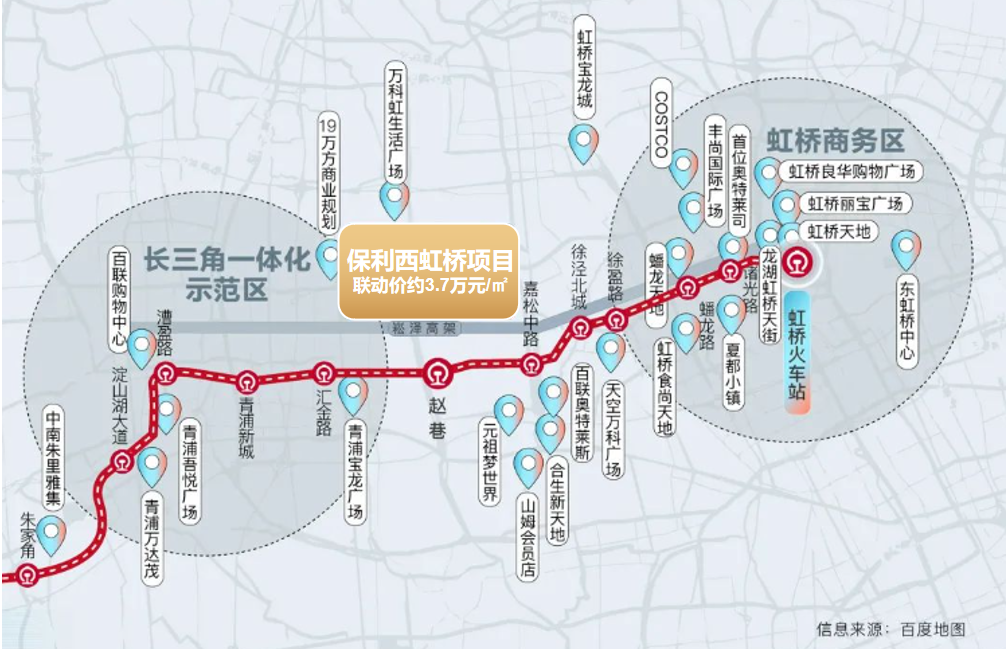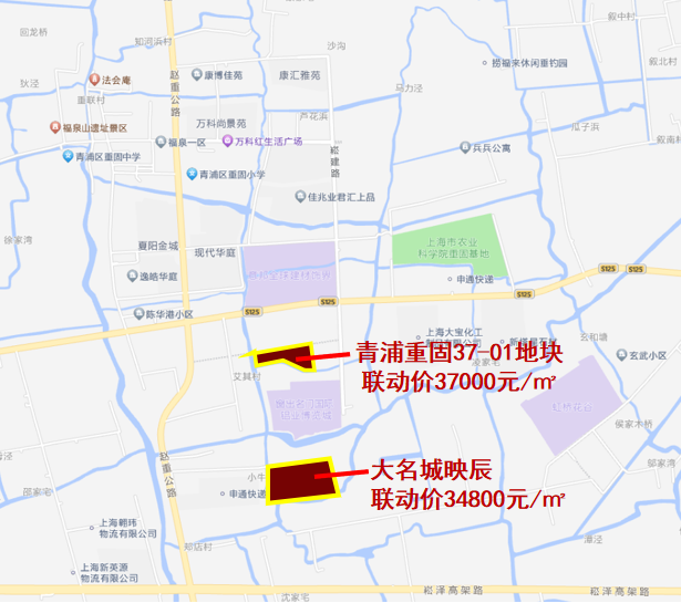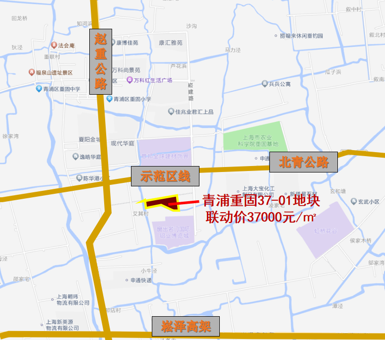 青浦地处两大国家战略大虹桥与长三角一体化示范区的中间位置,是上海乃至全国唯一拥有两大国家战略的区域。重固镇是上海文化名镇,上海古文化发源地,福泉山文化的代表之一,自唐宋时期便十分繁华;时至今日,在新型城镇化的政策背景下,名镇重固迎来了新时代的生活复兴。重固链接虹桥商务区、青浦现代新城,是长三角一体化示范区以及上海东西向发展轴带上的重点镇之一。区域当中规划和建设有沪苏嘉城际铁路,又称示范区专线,沪常高速、崧泽高架,有通达四方、产业集聚的作用。不仅产品出挑,项目周边配套也很完善,更有高能级规划正在落地,届时板块发展将更上一层楼!地块周边已建成配套设施集中在北青公路以北的重固老镇区。地块距离上海示范区线重固站约0.5km(在建,预计2028年底通车),距离17号线赵巷站约3km,距离崧泽高架约1.5km,可快速通达虹桥枢纽。沿着17号线,约220万方商业体量潮涌而来,每一站都是大型购物中心,约11.6万方虹桥天地、约25万方龙湖天街、约5万方蟠龙天地商业古镇、约10万方万科天空之城、约35万方宝龙广场、约37万方奥特莱斯+合生汇商业、约90万方淀山湖地铁站商业,下了地铁就逛街,吃喝玩乐购一站式体验。距离项目不远就有万科天空之城、百联奥特莱斯、万科红生活广场、山姆会员店、元祖梦世界等商业,从项目出发,几脚油门就能享受繁华。此外,距离项目约1.5公里的上海示范区线「赵重公路站」将规划19万方商业配套,未来业主在家门口即可邂逅都市潮流生活。教育是风向标,能看得出一个板块的定位。项目直线距离3.6公里的九年一贯制上海师范大学附属青浦实验学校。(仅是周边教育资源罗列,新房不保障学区)崧泽高架、赵重公路、北青公路等交通主干道,距示范区线(赵重公路站)(未开通)600米左右。商业设施主要集中于重固镇传统集镇上,有吉麦隆、万科红生活广场、两座菜场等。
