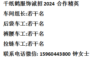车间组长若干名、裤腰车工若干名、拉链车工若干名