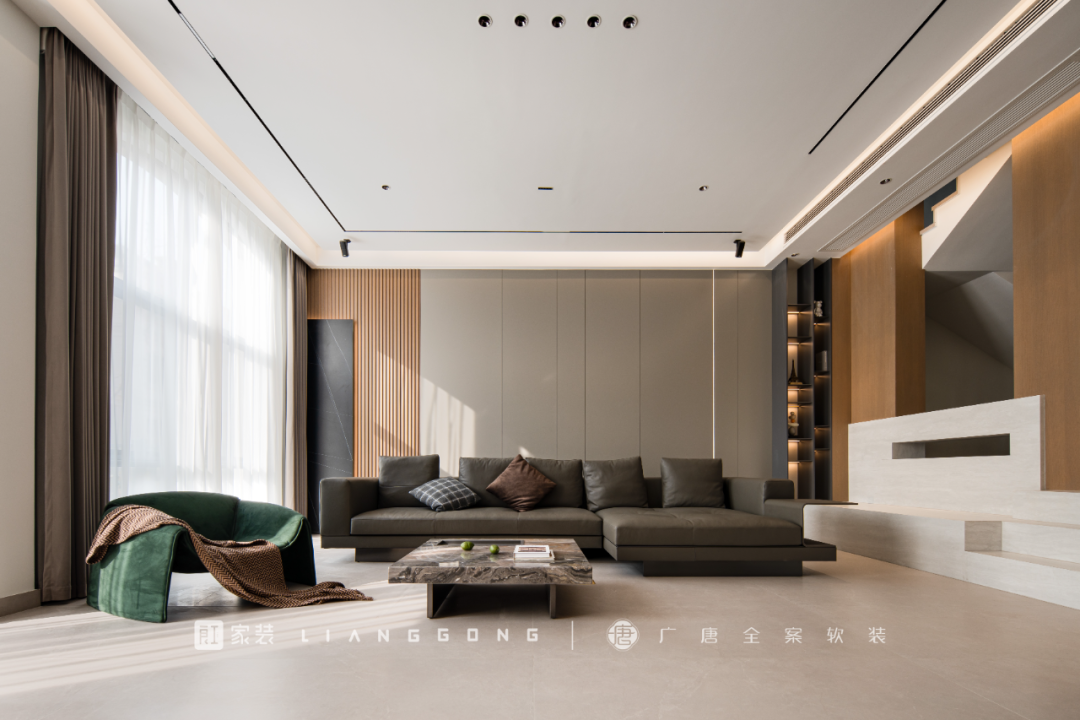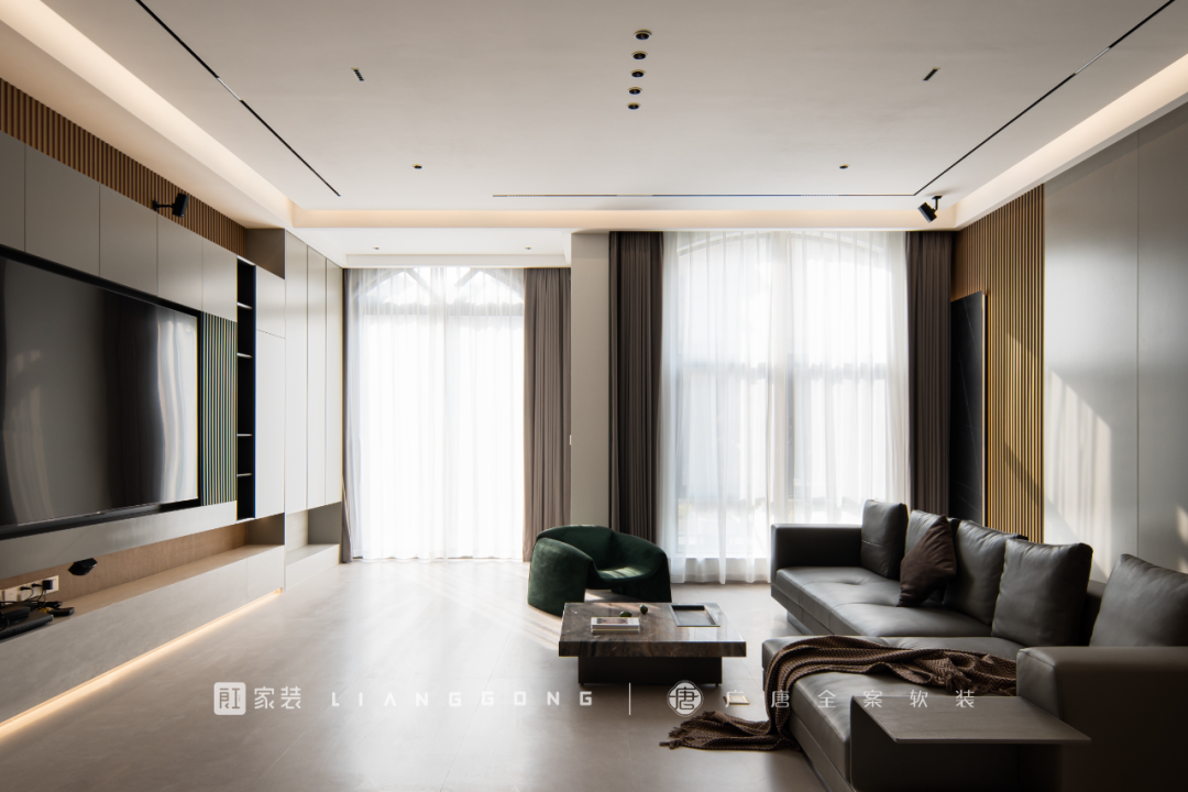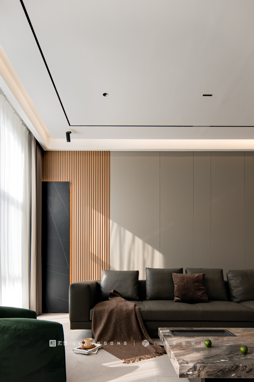 温润木面与高级灰的搭配,就像柔和与冷冽质感融合,不仅让空间更具层次感,极简的线条与块面组合,更赋予居室现代摩登气韵。