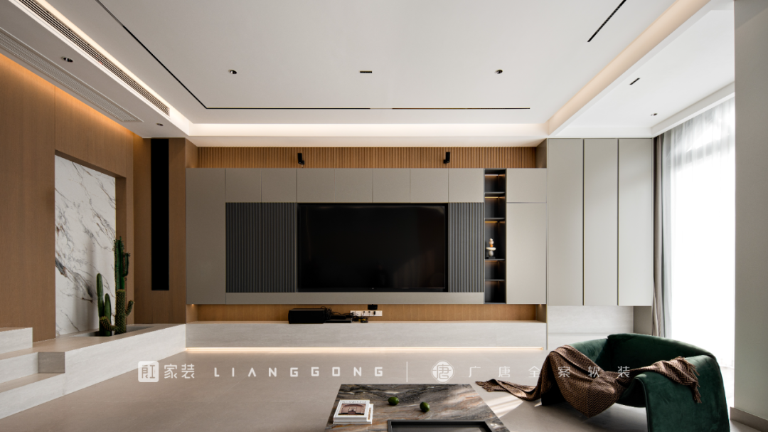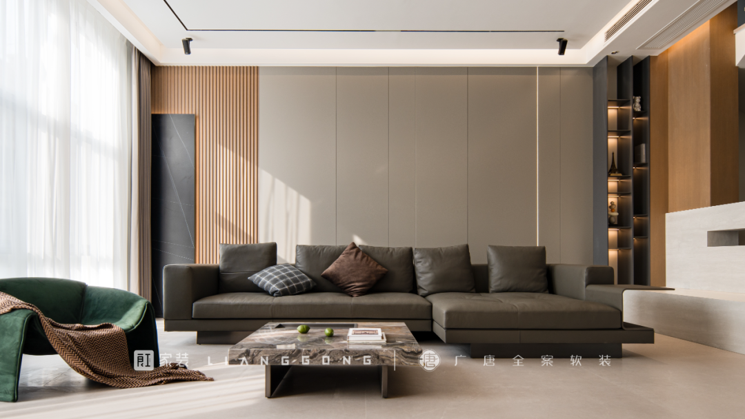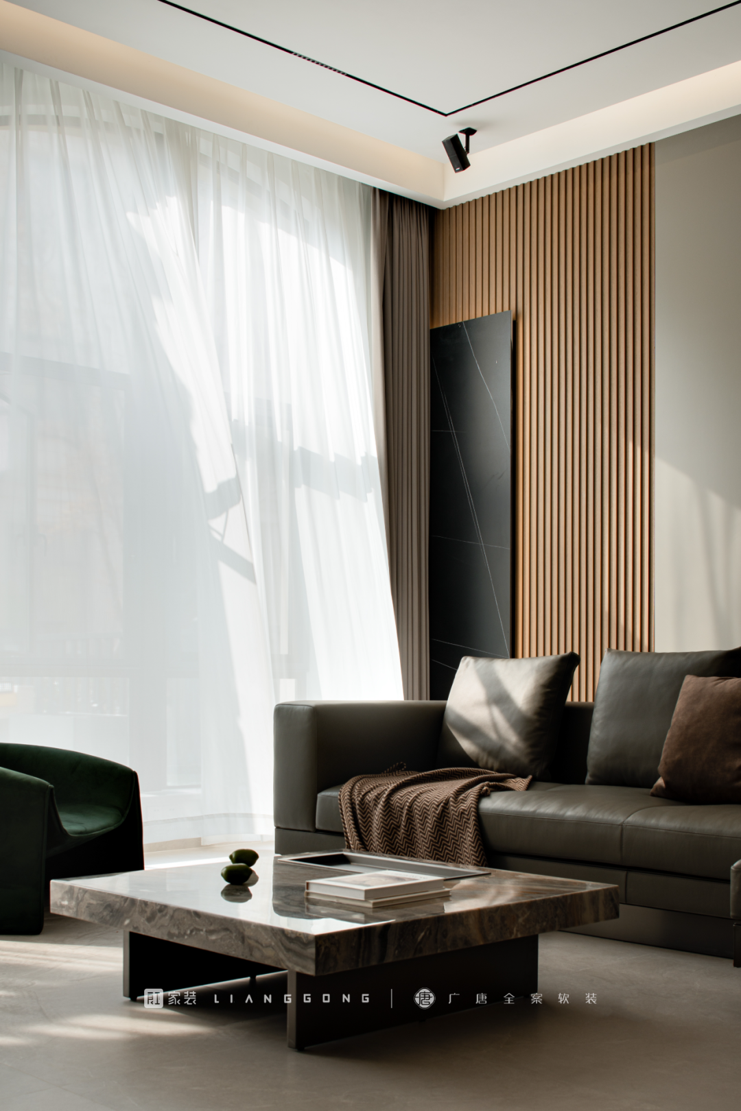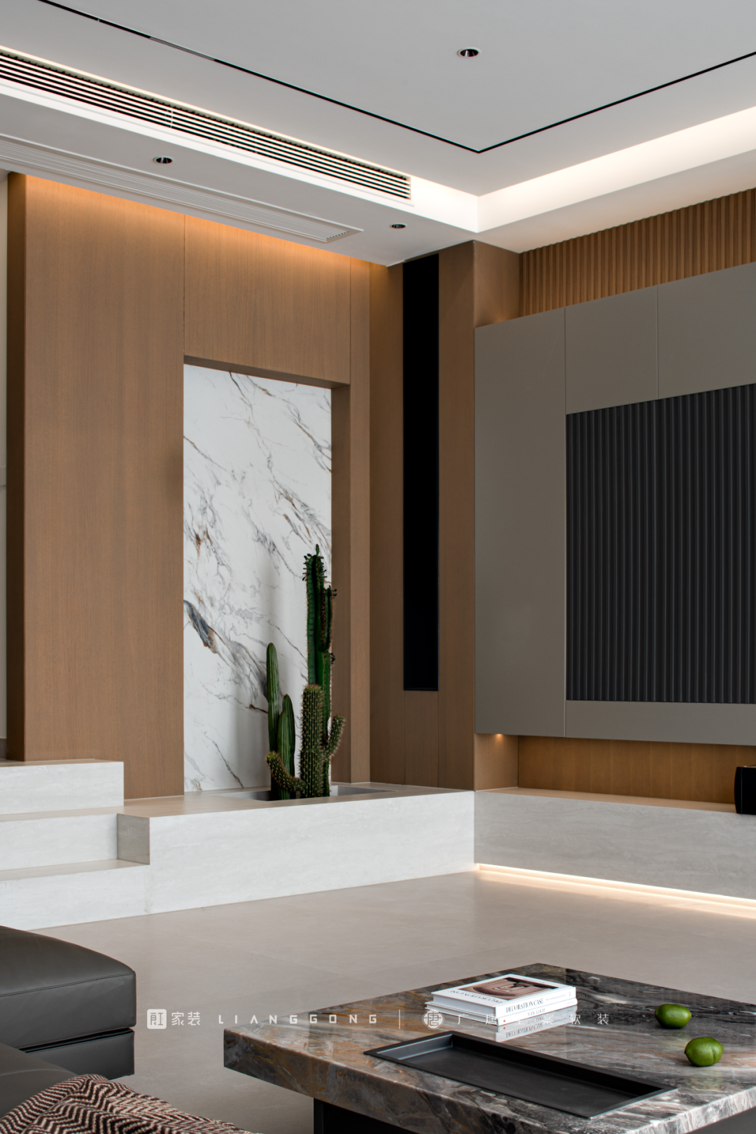 温润木面与高级灰的搭配,就像柔和与冷冽质感融合,不仅让空间更具层次感,极简的线条与块面组合,更赋予居室现代摩登气韵。