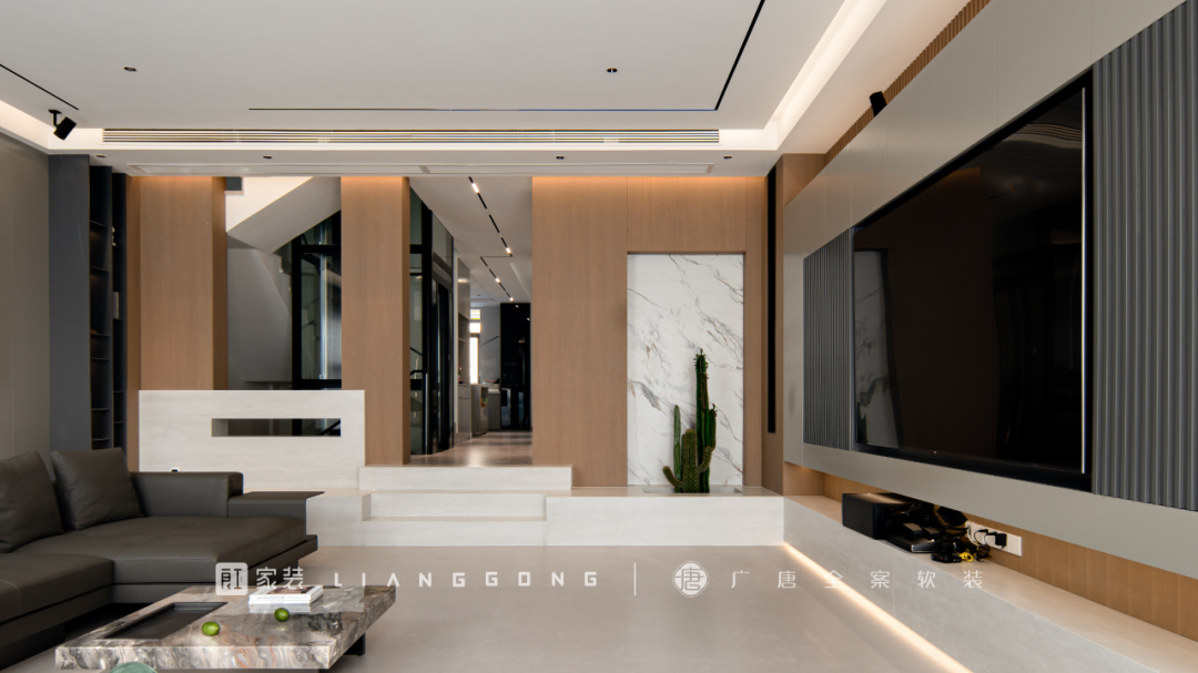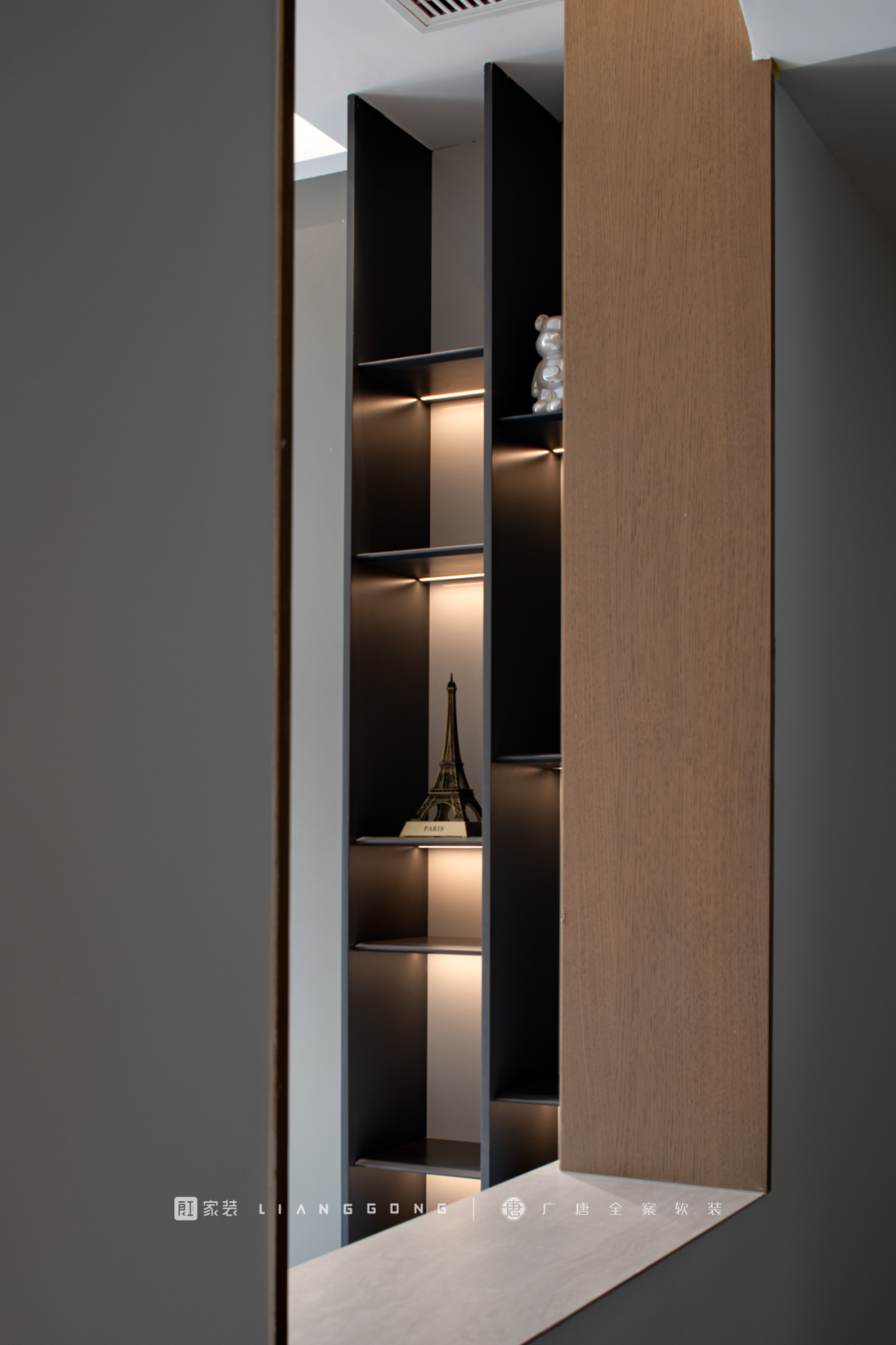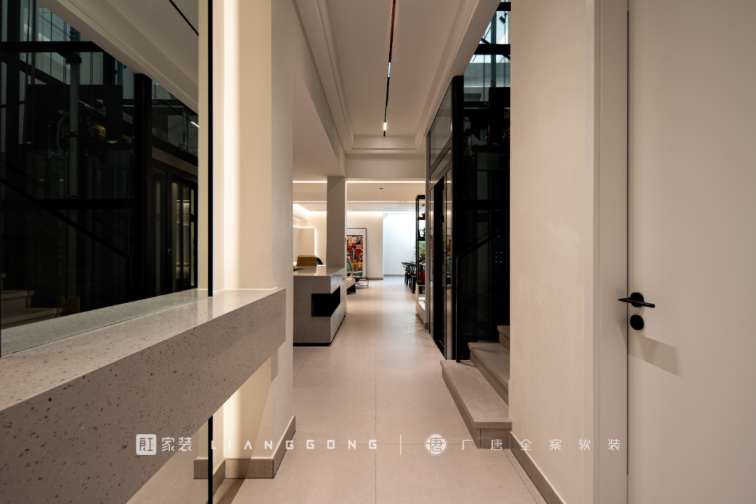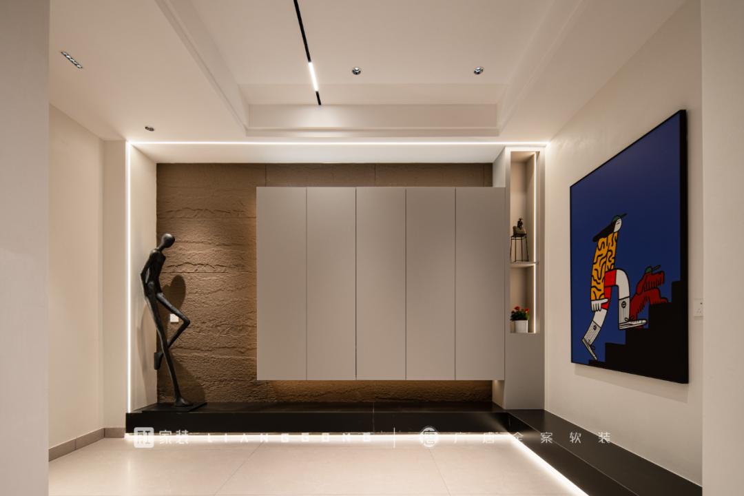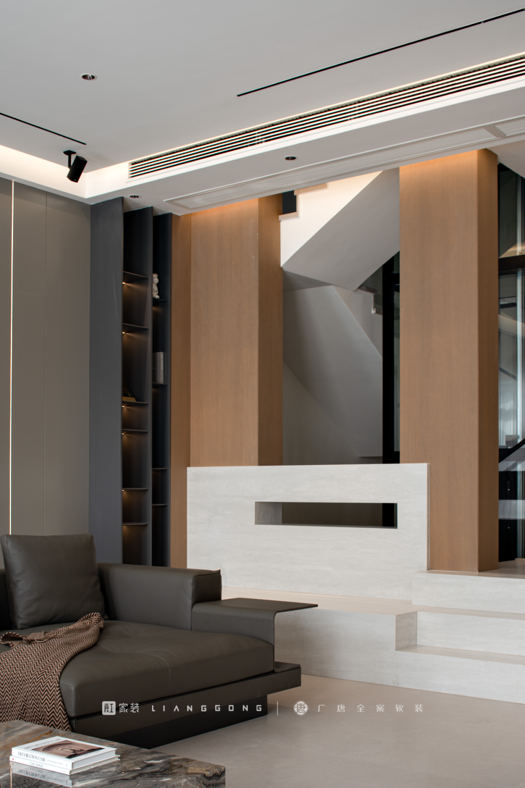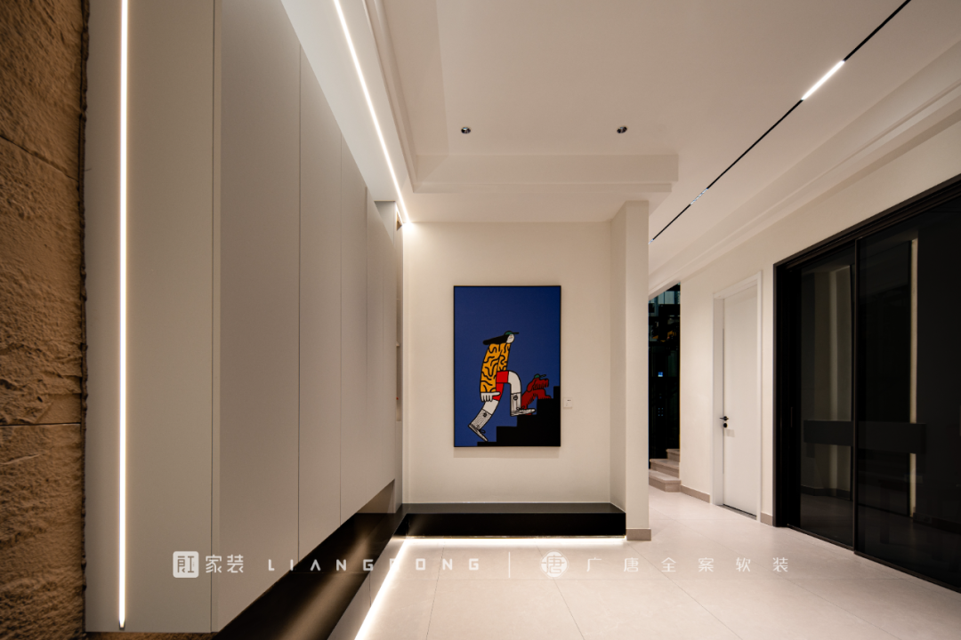 客厅与楼道、玄关等区域不仅以台阶进行错层设计,更巧妙运用局部镂空处理,实现空间之间的绝妙联动与对话。