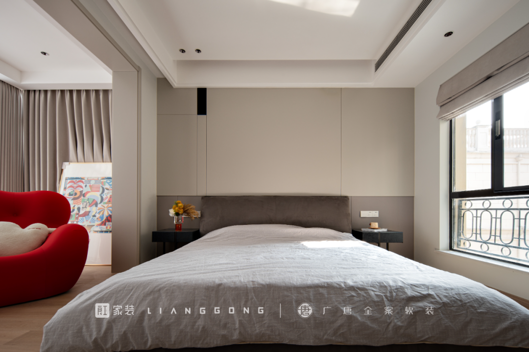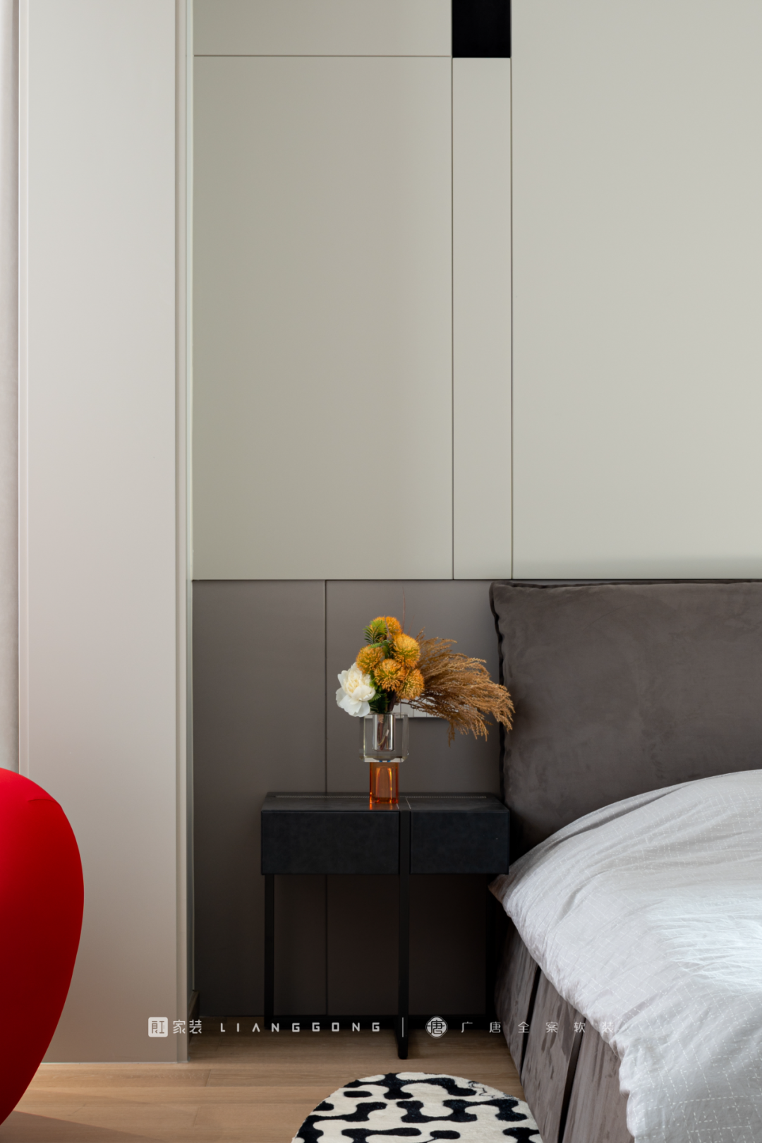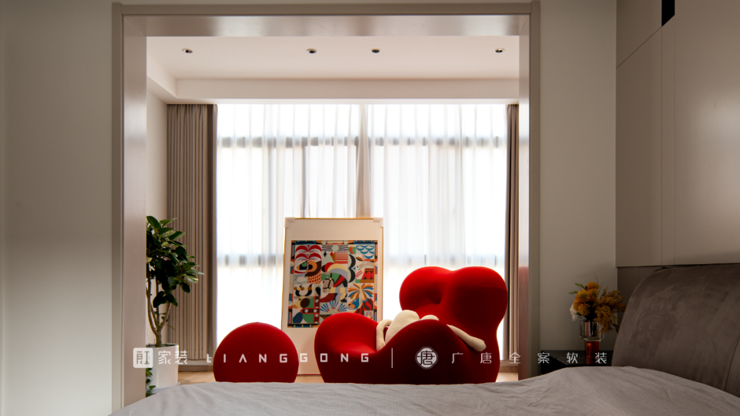 打通的阳台纳入室内,作为了睡眠空间的休闲区,红色的软包沙发与明艳的装饰画搭配其中,跳跃的色系元气满满,氤氲出美轮美奂的艺术格调。