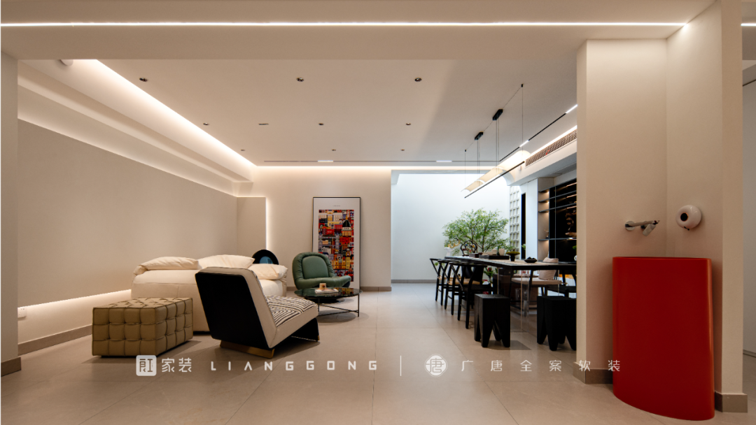 打通的阳台使空间感无限延展,无主灯加持下,整个公区充满了简洁、通透且考究的氛围感,激发出极度舒适的宜居属性。
