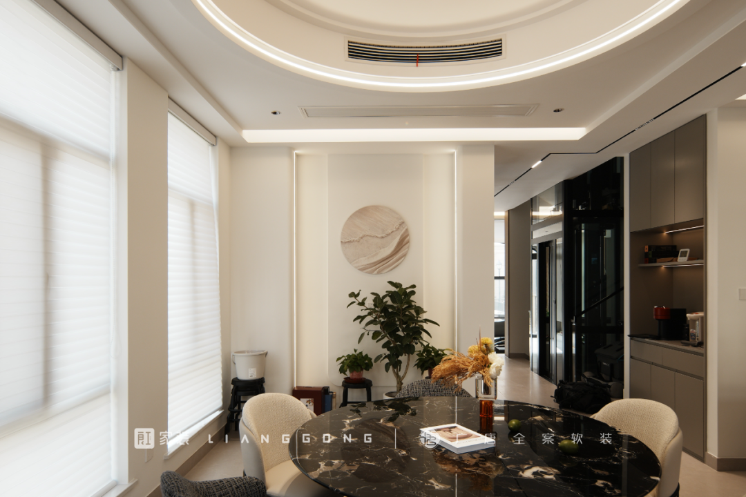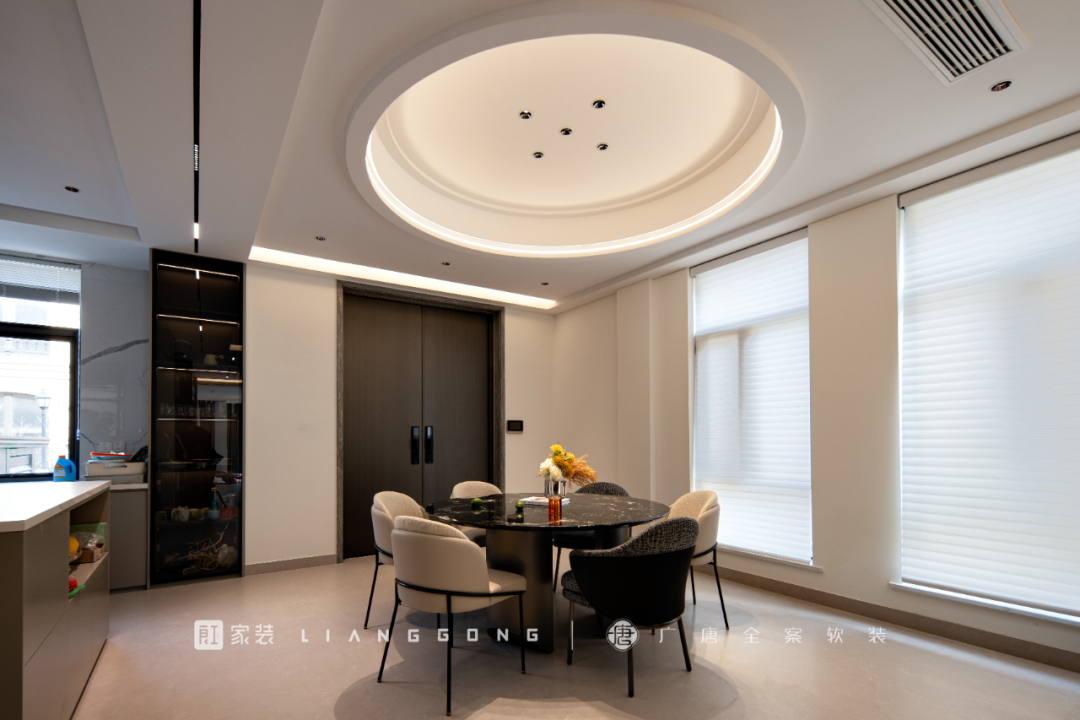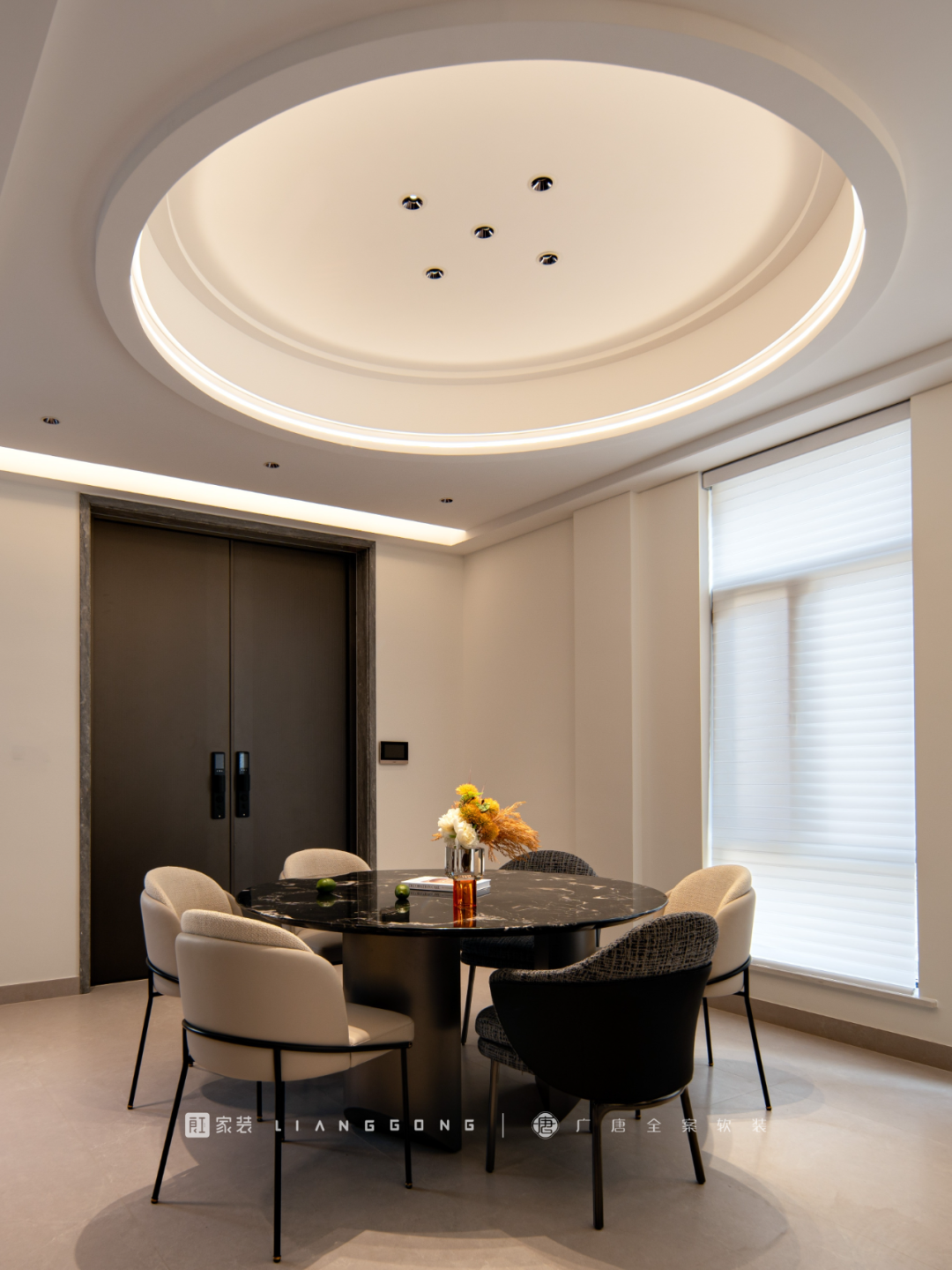 圆桌既满足环形动线走向,与顶面的圆弧吊顶也彼此呼应,形成纵向拉伸的视觉美感。