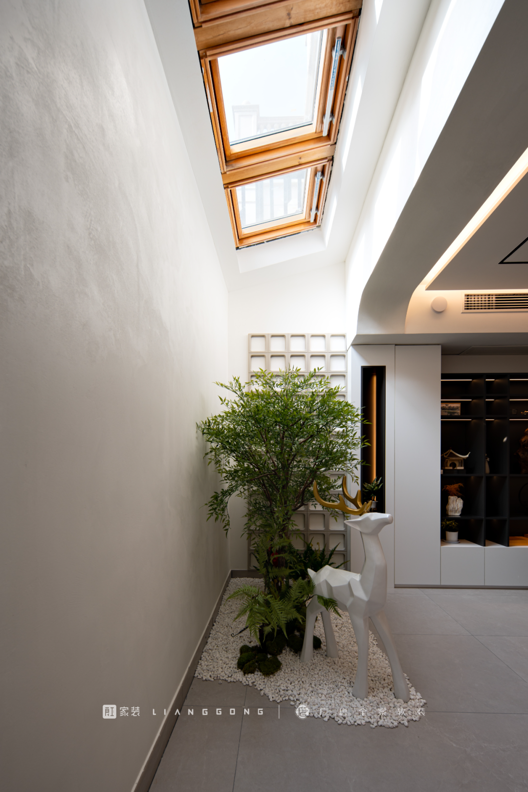 整个空间的呈现属于结构与软装的联合发力。沙发、茶几到摆设,都贯通极简审美,以克制手法打造出简而有味的居住气质。