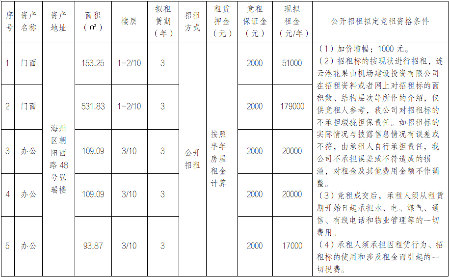 1.位于海州区朝阳西路48号弘瑞楼1-2/10层门面,面积约153.25平方米;2.位于海州区朝阳西路48号弘瑞楼1-2/10层门面,面积约531.83平方米;3.位于海州区朝阳西路48号弘瑞楼3/10层办公用房,面积约109.09平方米;4.位于海州区朝阳西路48号弘瑞楼3/10层办公用房,面积约109.09平方米;5.位于海州区朝阳西路48号弘瑞楼3/10层办公用房,面积约93.87平方米;(二)标的一切均以实地现状为准,请参加竞价招租的单位和个人务必看清和了解所招租场地之现状及瑕疵。参加竞价招租者一旦报名,即表明已了解和认可所招租场地品质、瑕疵等一切情况,我单位不保证所招租场地品质及缺失,也不承担瑕疵担保责任。(三)场地租赁权期限3年,在签订合同时须交纳一定数额租赁押金,租金可选择按半年支付或按年支付,采取先付后用方式。二、招租形式:公开竞价,以租金出价最高者中标。同一竞价者允许同时参加多个标的的竞价。三、招租声明:为维护国家和社会公共利益,我公司保留在签订合同之前任何时候接受或拒绝任何竞价者中标的权利,且对受影响的竞价者不承担任何责任。(一)凡有意参加竞价招租的单位和个人,须在我公司办理有关报名手续后,方可参加竞价招租活动。单位凭营业执照、法人证明或法人委托书、公章办理;个人凭身份证办理竞价招租报名手续。公开竞价时每一竞价者需提交竞价保证金2000元。竞价保证金存入下列账户,户名:连云港花果山机场建设投资有限公司,开户行:中国建设银行股份有限公司连云港分行营业部,账号:32001658636059111222(注:弘瑞楼房产公开招租竞标保证金)。保证金是否到账,以银行出具的进账单(或转账记录)为准。招租结束后,未中标者,3个工作日后10个工作日内无息退还竞租保证金。中标者保证金直接抵作承租押金。(二)报名时间:2024年3月29日—4月15日(9:00-12:00,13:00-17:00)(三)展示时间:4月16日(9:00-12:00,13:00-17:00);展示地点为房屋所在位置。(四)报名地址:连云港花果山机场综合办公楼302室所有门面在经营中,不能进行经营餐饮、屠宰家畜或存放易燃易爆物品等行业,不得用于经营各类加工厂和其他对辖区生活秩序、环境产生噪音或造成影响的经营项目,不得占用道路、人行道经营,必须自觉维护门面外人行道的公共环境卫生,保持环境整洁,自觉接受执法等相关部门的管理。 连云港花果山机场建设投资有限公司