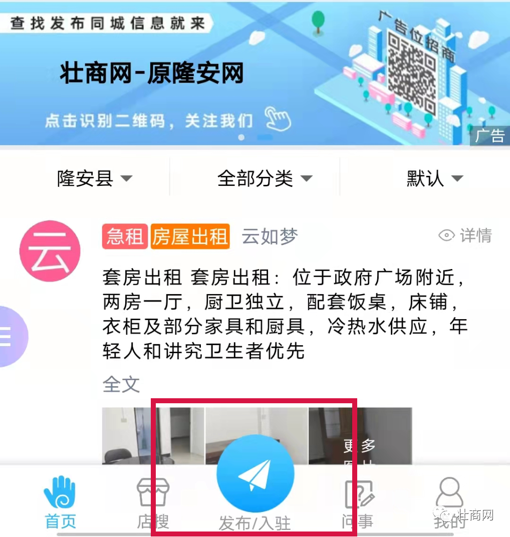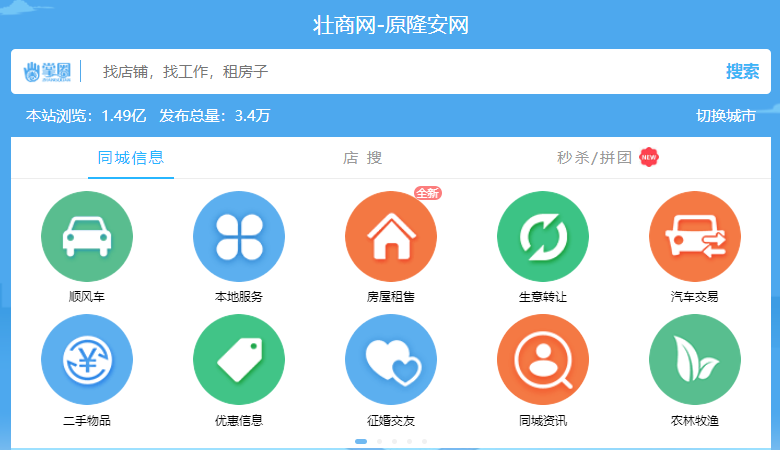 壮商网便民发布平台专注为隆安人提供便民信息发布/查询服务。为您提供房屋出租、生活服务、找房子、家政服务、征婚交友、房租出售、二手交易、失物招领、同城服务、生意转让等海量分类信息,充分满足您免费查看/发布信息的需求。