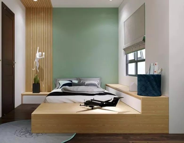 如果把矮床做成多功能收纳柜,与书桌衣柜一体,环境会更显统一、整洁。也更加干练、宽阔。