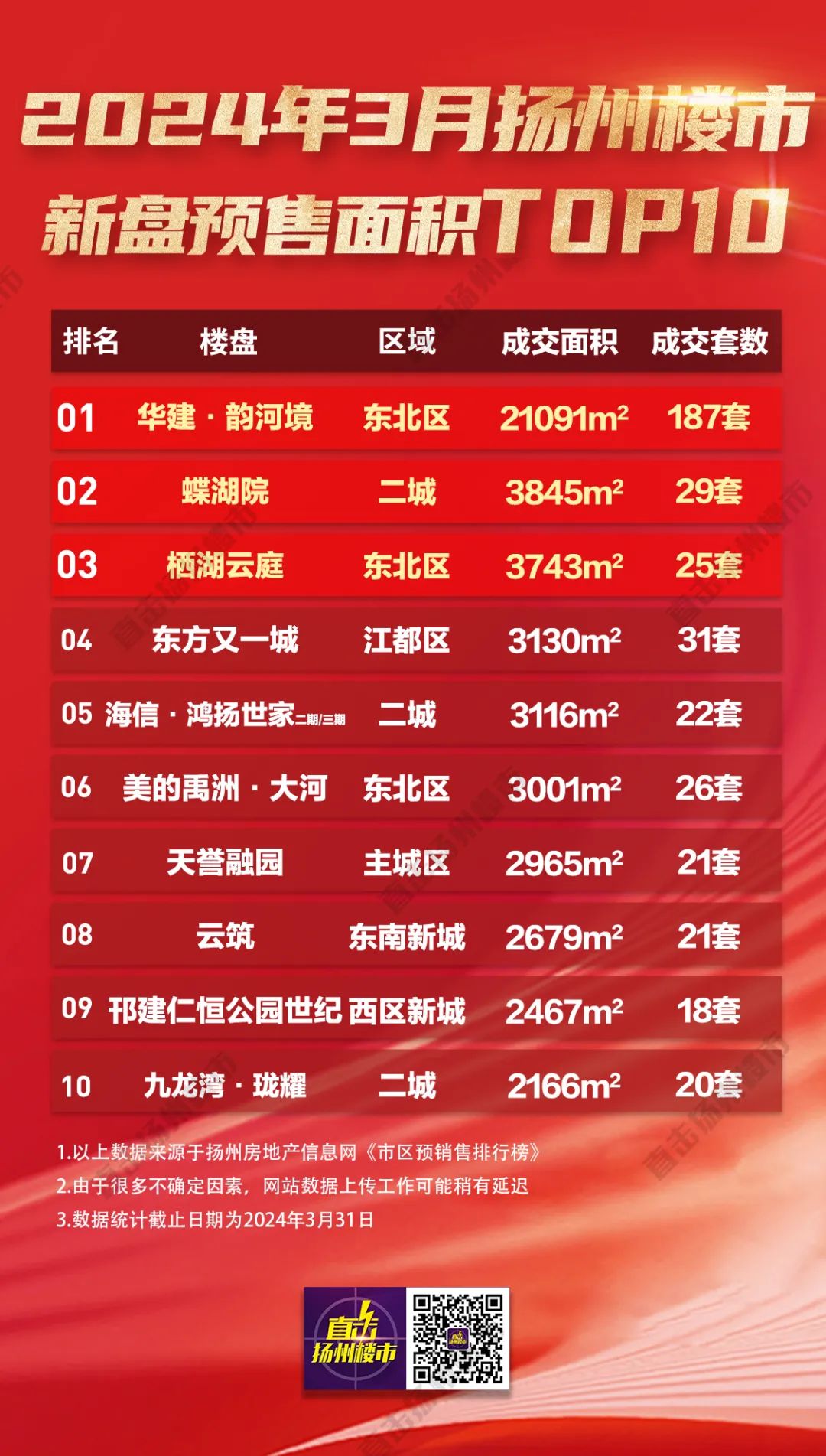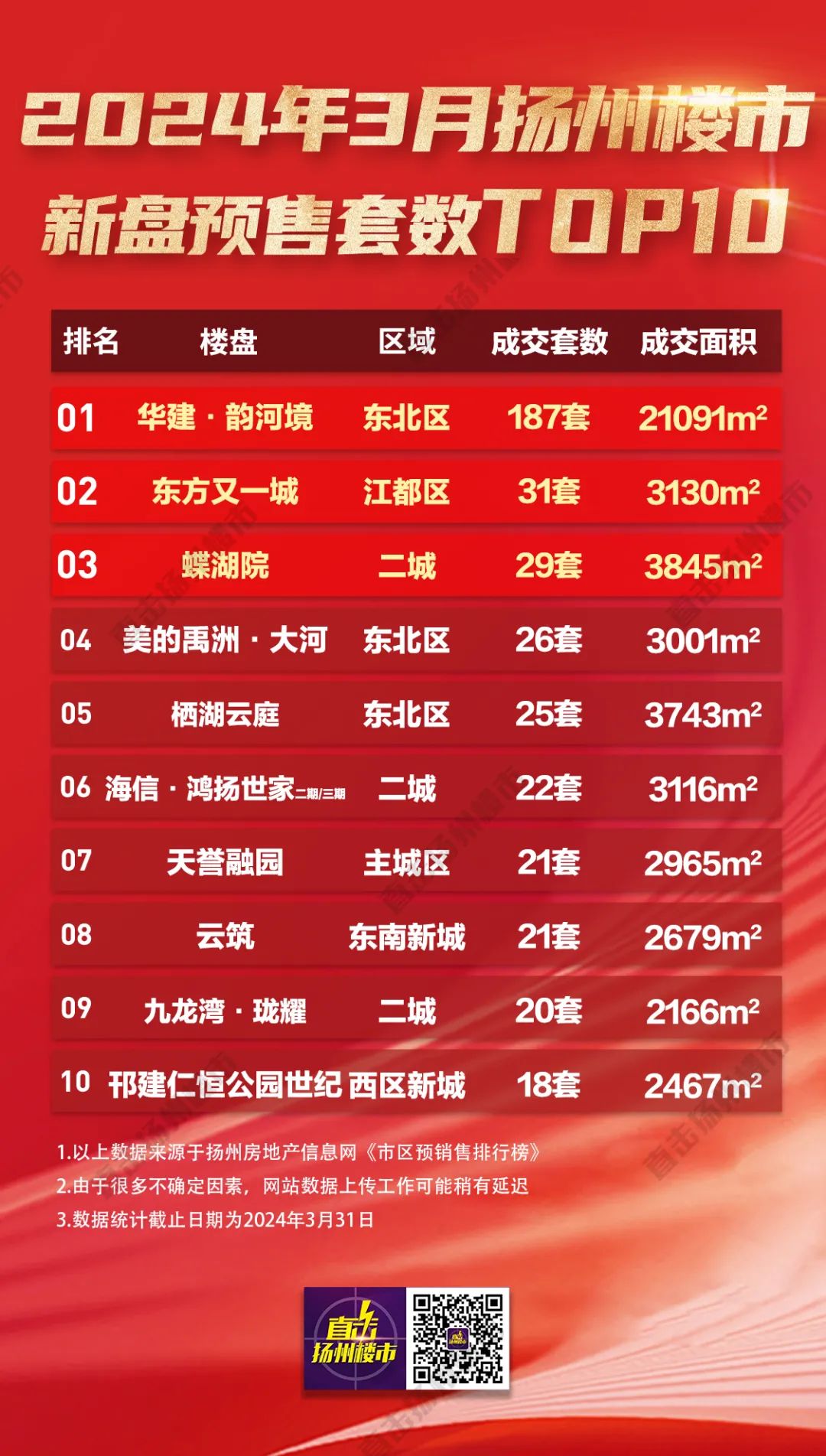 刚刚,2024年3月扬州楼市销售排行榜TOP10出炉!