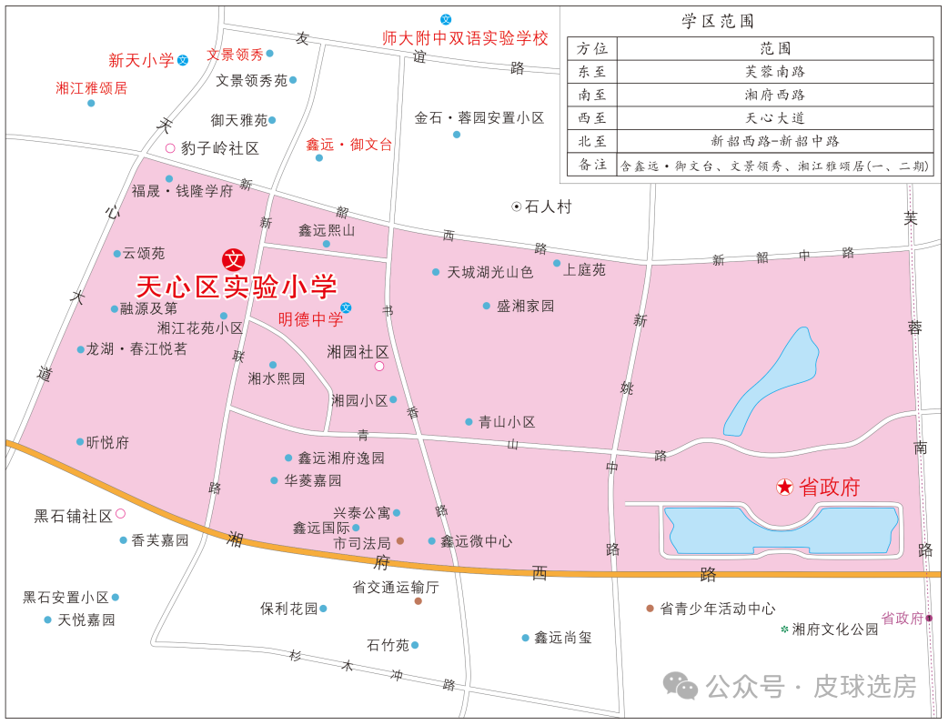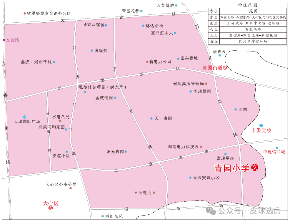 主要小区、楼盘或单位宿舍包括:鑫远御文台、文景领秀、湘江雅颂居(一、二期)、福晟学府、逸园、鑫宸公寓、鑫远熙山园、御文雅苑、文景领秀苑、华菱园、盛湘家园、兴泰公寓、湘水熙园、湖光山色、湘园小区、青山小区、及第府、春江悦茗、昕悦府、湘江花苑小区、云颂苑。