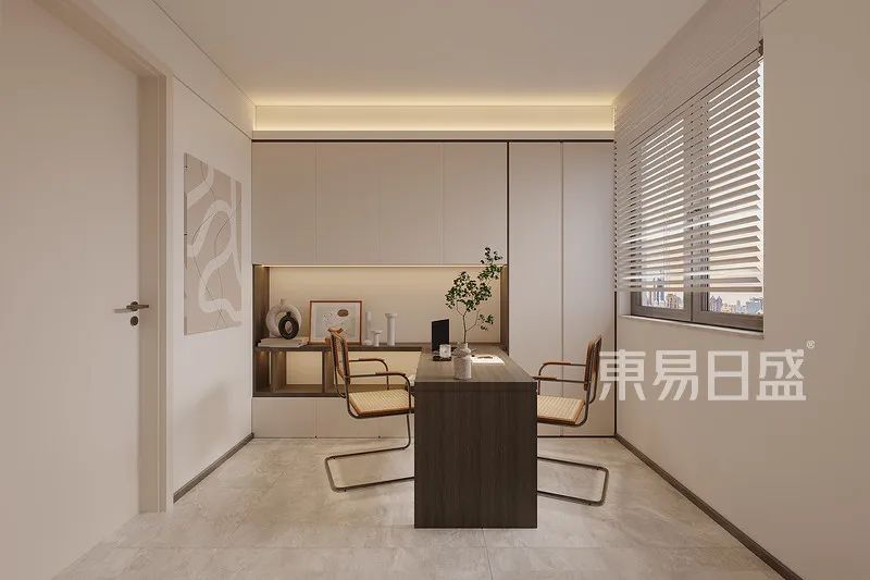 书房简约而不简单,定制书柜内嵌书桌,实用性极强。书籍和杂物都能整齐摆放,营造出宁静的工作氛围。