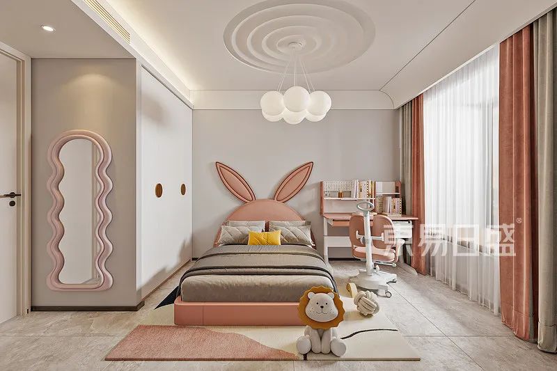 女儿房甜美可爱,梦幻十足。粉色系点缀,营造出浪漫氛围。顶面石膏花盘,弧形窗帘盒设计,为空间增添了一丝柔美。在这个童话般的世界里,让女儿度过美好时光。