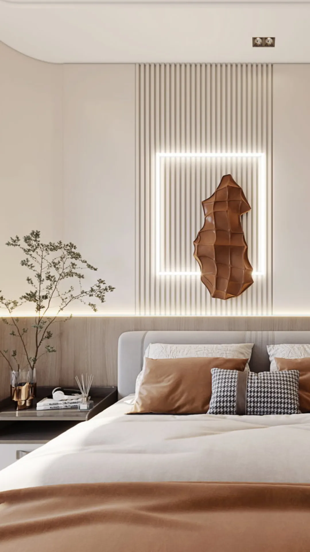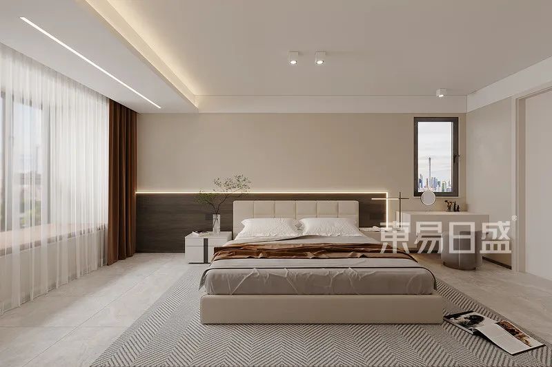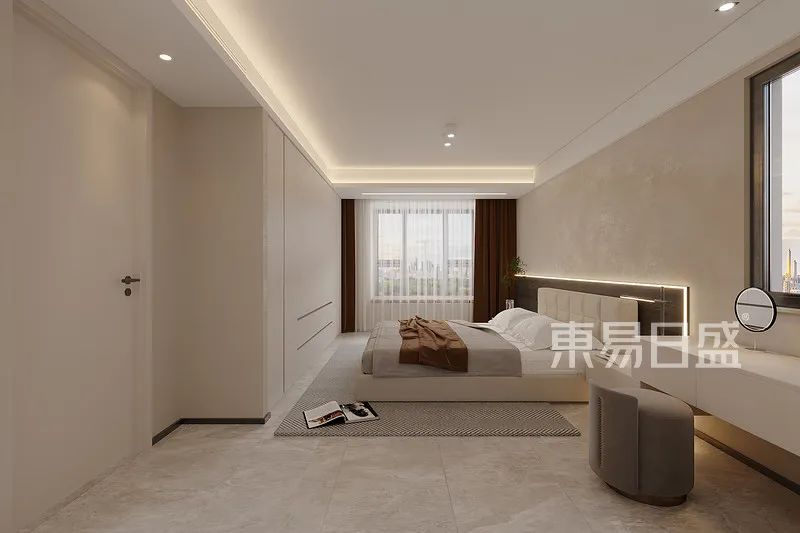 主卧氛围时尚优雅,舒适宜人。木饰面带灯带的床头背景,营造出温馨氛围。墙面采用特效漆,质感独特,彰显个性。在这个宁静的私密空间,享受恬静的生活品质。定制的通顶衣柜设计在床尾,实用便捷,收纳能力Max。