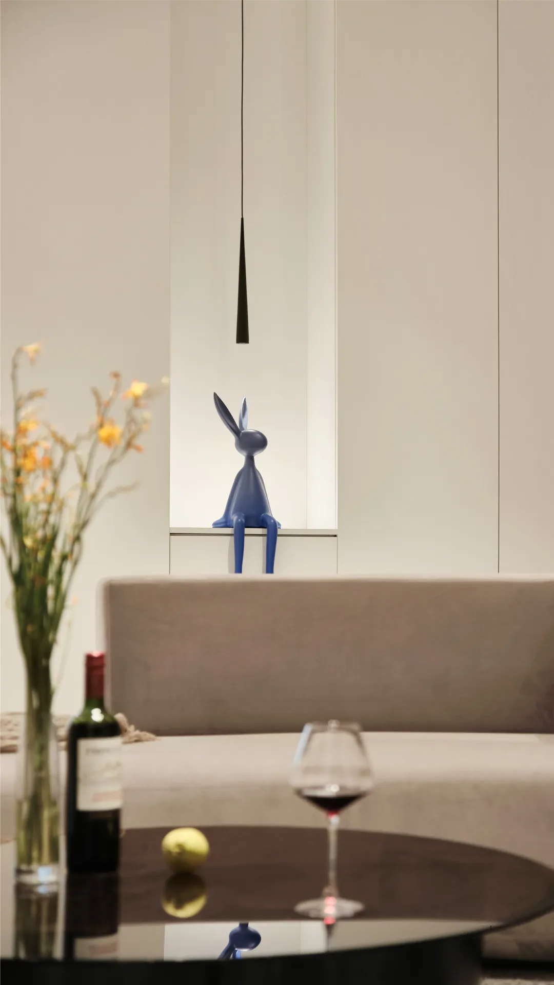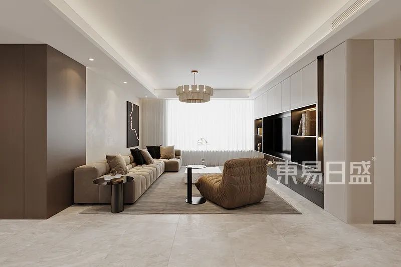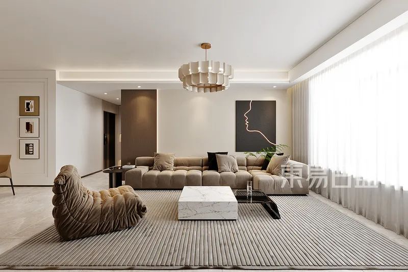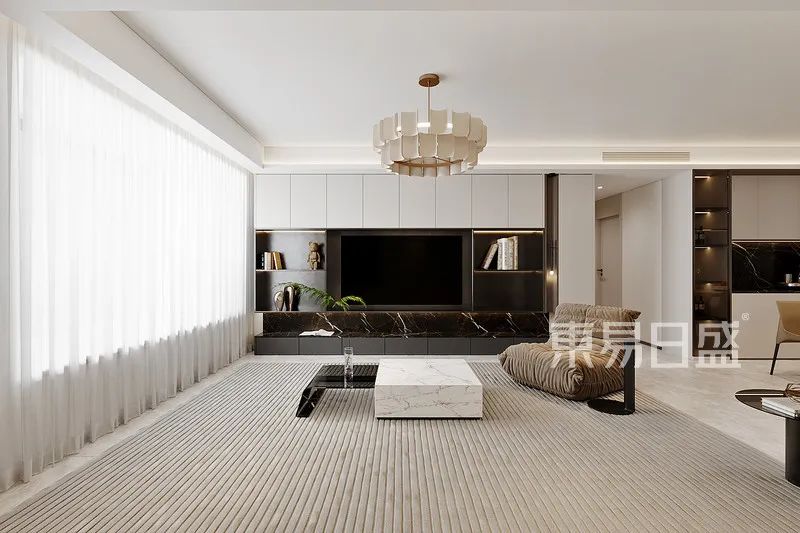 穿过选过来到了客厅,放眼望去整个空间简约高级整体色调柔和淡雅。白色加深色石材的定制电视柜完美地融入了空间,既不突兀,又具有实用性。中间主灯的设计强调了客厅的空间感,营造出明亮舒适的氛围。吊顶的灯带更是点睛之笔,为空间增添了一份温馨与浪漫。整个空间大气典雅,展现了一种恬静与和谐的氛围。