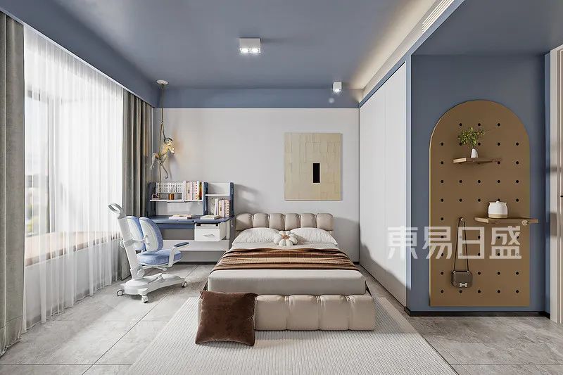 男孩房活力四溢,格调非凡。蓝色搭配浅灰的色调,营造出宁静的氛围;衣柜上面的灯带,增添了空间的层次感。在这个舒适的私人空间,让男孩自由成长,探索美好的未来。