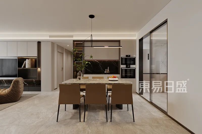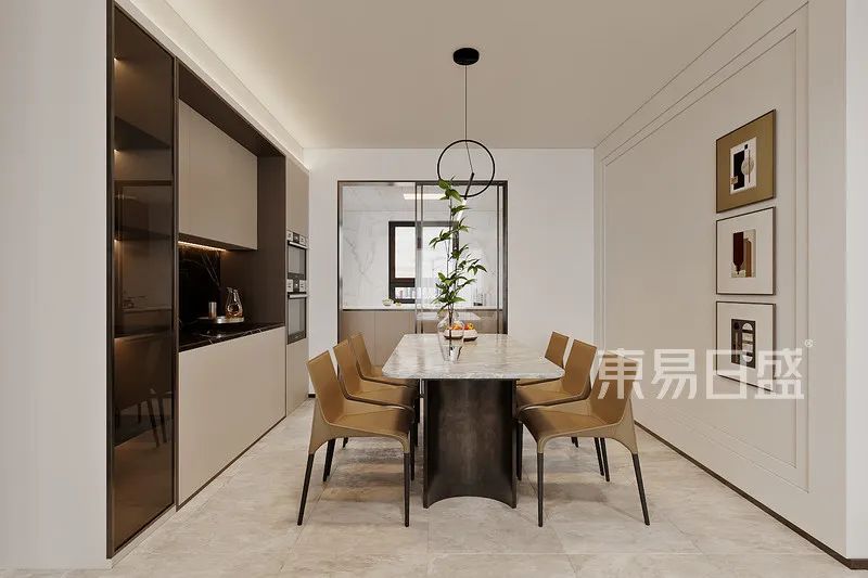 餐厅采用当下年轻人喜欢的开放式布局,空间通透感十足。白色的大理石餐桌搭配色彩鲜明的座椅,营造出活力四溢的用餐氛围。精致的餐具,优雅的布置,让一家人在享受美食的同时,感受到现代生活的精致与美好。