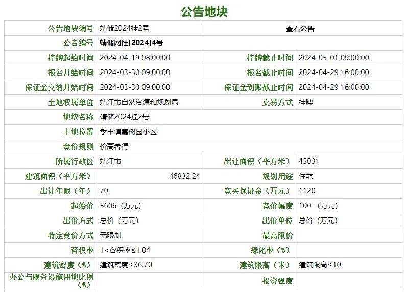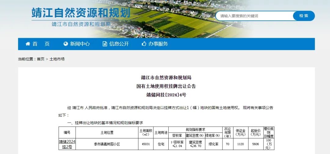 经靖江市人民政府批准,靖江市自然资源和规划局决定以挂牌方式出让1(幅)地块的国有土地使用权。现将有关事项公告如下: