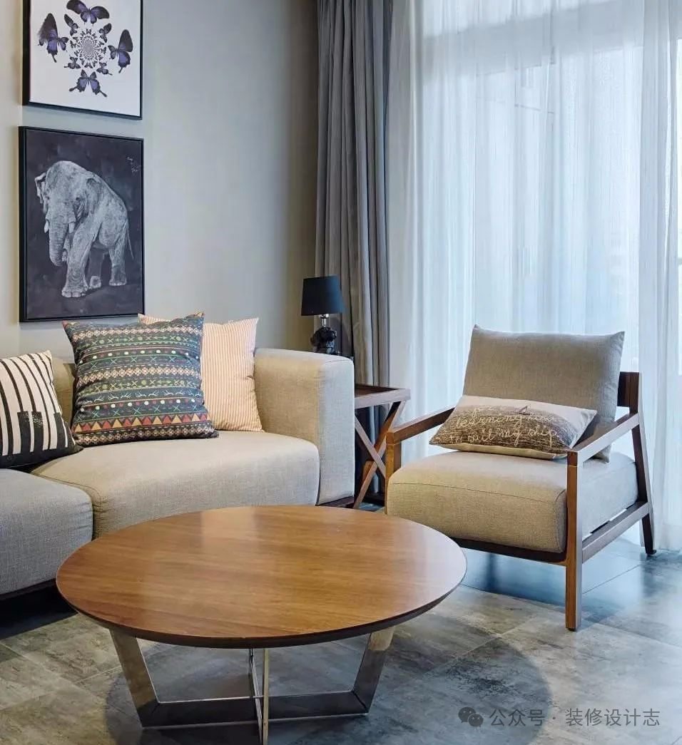 在摆上木质圆茶几,不占地方还可以轻松随意移动,在复古风的仿古砖地面基础下格外耀眼。