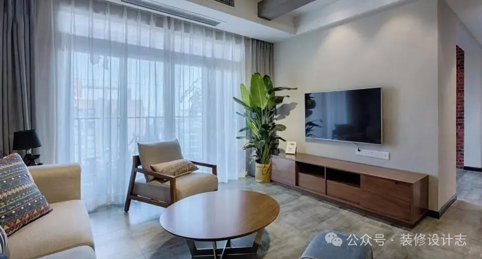 客厅电视墙是暖灰色的乳胶漆,结合顶上的筒灯照射,搭配实木电视柜与侧边角落的芭蕉叶绿植,带来的是一个清新自然的视觉感。