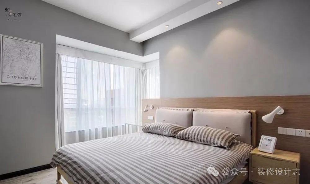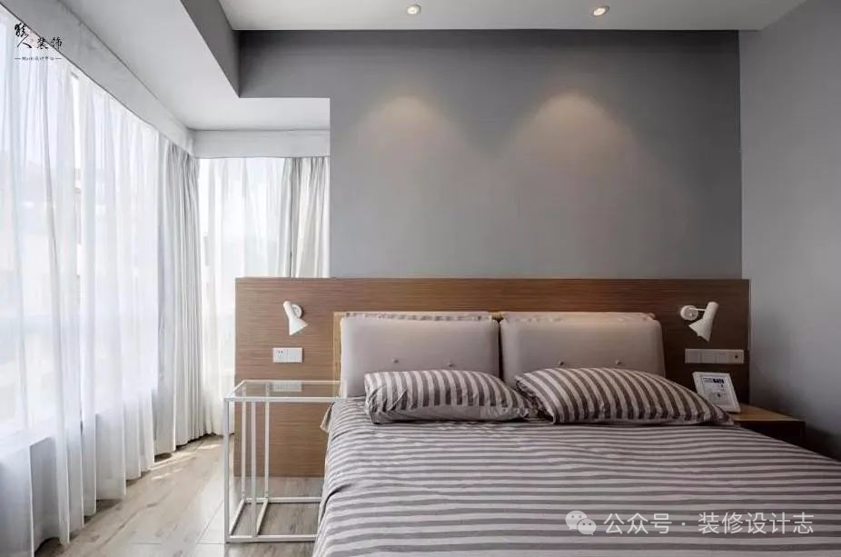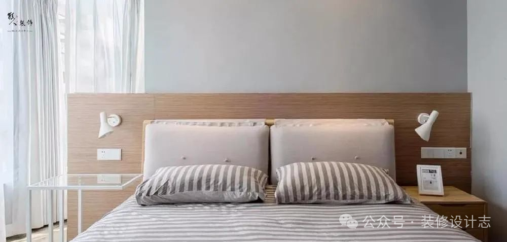 浅灰色的卧室墙面基础,床头靠墙的位置安装了护墙板。
