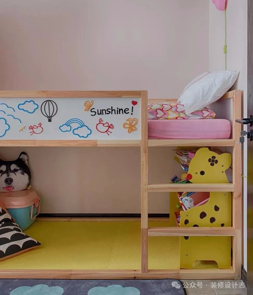 儿童房的定制高架床,床底留空作为孩子的活动区域,淡粉色的墙面,结合活泼色调的软装布置,让孩子的空间充满了活力与童趣感。