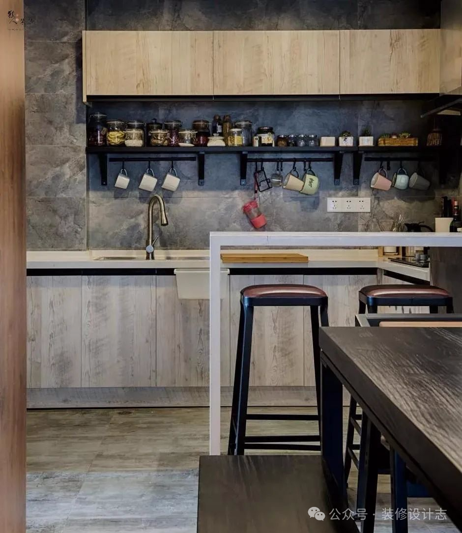 厨房与客厅采用开放式的格局,灰色墙面与定制橱柜,操作台前的墙上也装了黑色的收纳架,各式各样的料理瓶与厨具收纳在上面,井然有序。