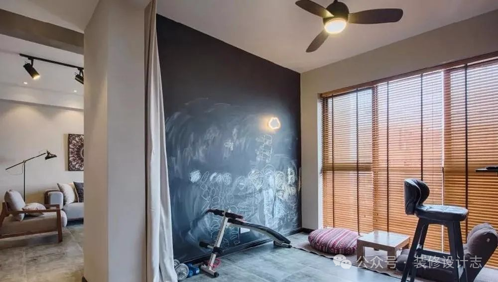 以布帘隔离,刷上一面黑板墙,顶上一盏吊扇灯,让这个空间的利用充满了想象空间。